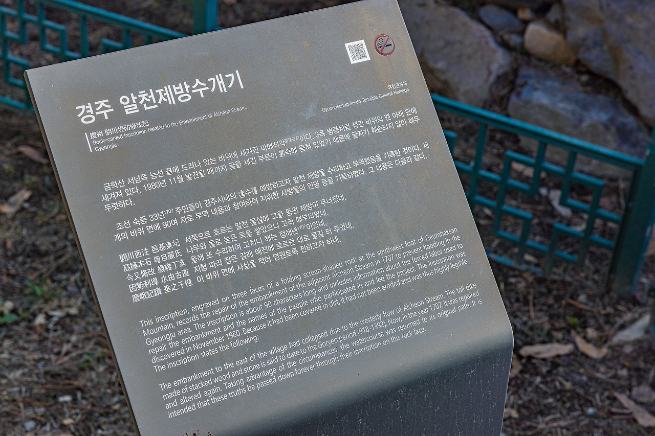 알천제방수개기를 보고 단순히 아, 제방이 무너져서 고쳐지었구나.라고 생각한다면 이곳은 별 의미 없는 장소가 된다. 종이가 귀한 삼국시대도 아닌 조선시대에 굳이 제방을 수리한 기록을 이렇게 바위에 새기면서까지 남겨야 하는 이유는 그다지 없으니까.