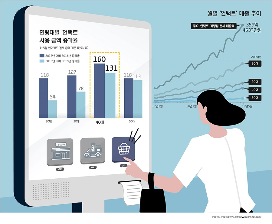현대카드·현대캐피탈 뉴스룸의 결제 데이터에 따르면, 매년 언택트 소비가 크게 늘고 있다고 한다. 언택트 마케팅을 선보이는 주요 가맹점 15곳의 매출은 2017년 1월 약 67억 원에서 2019년 5월 359억으로 5배 수준이 되었다고 한다. 또한, 이번 분석을 통해 밀레니얼 세대가 언택트 시장을 주도하고 있다는 점도 확인됐다. 언택트 주요 가맹점 15곳의 매출 중 20대와 30대의 결제 금액이 차지하는 비중은 28.4%, 50.7%로 밀레니얼 세대에 해당하는 2030이 전체 매출 중 80% 가까운 비중을 차지했다. 이번 분석에서 가장 눈에 띄는 대목은 40대 소비자의 언택트 서비스 수요가 가파르게 증가하고 있다는 점이다. 40대의 언택트 관련 결제 금액을 보면 2018년 1~5월에는 전년 동기 대비 약 160%, 2019년 1~5월에는 전년 동기 대비 약 131% 증가했다. 2년 사이 약 499%에 달하는 폭발적인 증가율을 기록한 것으로, 이는 20대의 235% 및 30대의 304%를 크게 앞지른다. 2030 세대가 언택트 시장을 만들고 키웠다면, 40대는 이 시장에 빠르게 합류하면서 언택트 소비를 전 연령대로 확대하고 있는 것이다.