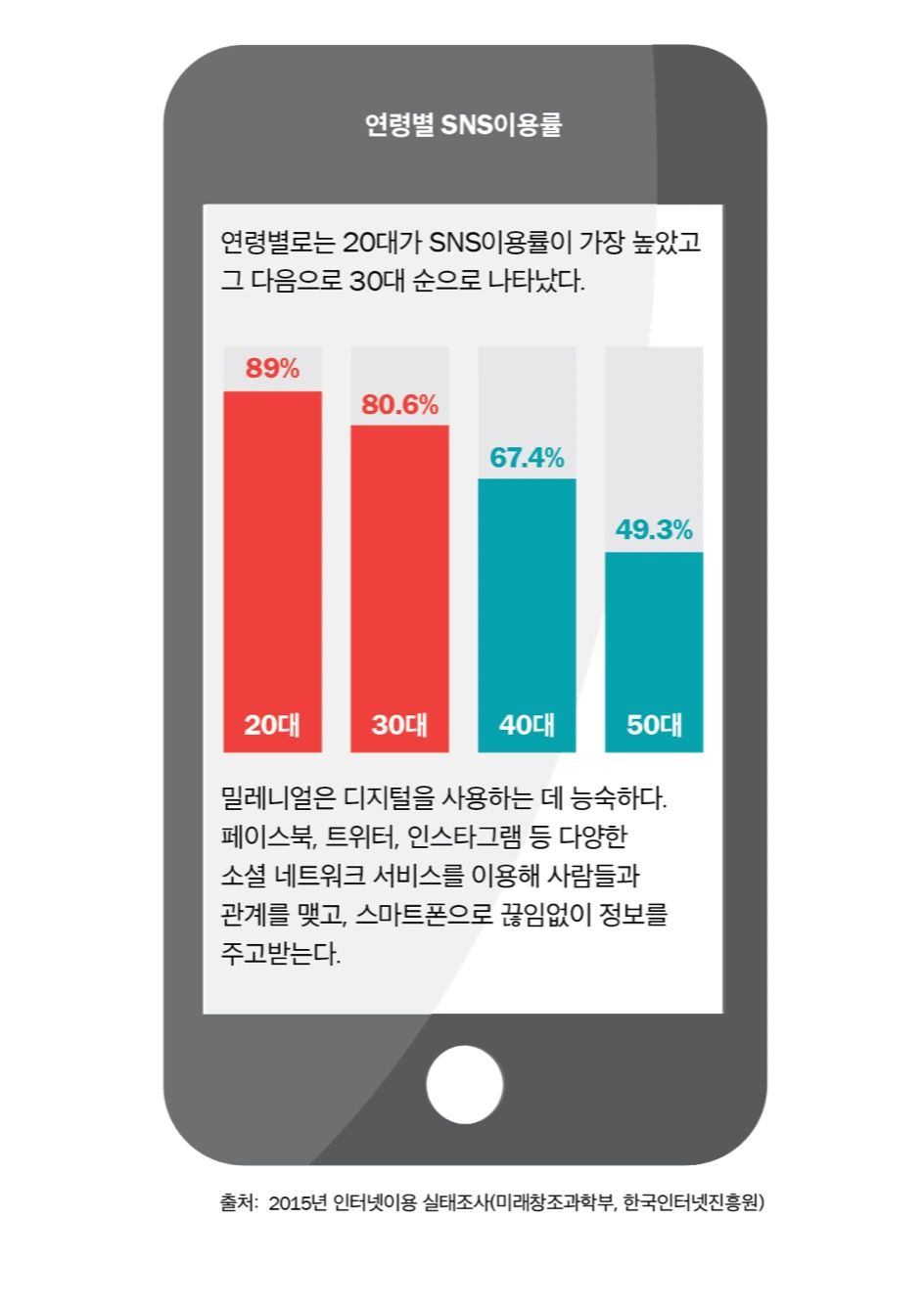위에서 말한 것처럼 통계적으로도 40대의 소비 비중이 늘어났지만, 모든 소비의 중심은 2030 밀레니얼 세대에게 있다. 그렇기 때문에 기업들은 밀레니얼 세대의 라이프 스타일과 특성을 반영하여 소비 트렌드를 맞춰나가고 있다.