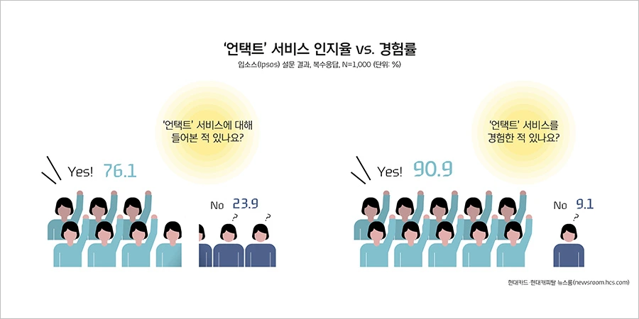 언택트는 앞으로도 상승세를 탈 것이라는 전망이 다수다. 밀레니엄 세대가 경제력이 비교적 낮은 2030 세대임에도 불구하고 시장에 많은 영향을 끼치는 것처럼, 밀레니엄 세대가 경제력이 강한 4050 세대로 가면 더욱 큰 영향을 끼칠 것이라 바라보기 때문이다. 무엇보다도 언택트 서비스는 일부의 소비자만이 환호하는 유행이 아니라, 일상 생활에 깊숙이 파고들었다는 점에서 전망이 밝다. 현대카드·현대캐피탈 뉴스룸이 리서치사 ‘입소스(Ipsos)’에 의뢰해 20대부터 50대까지 총 1,000명을 대상으로 진행한 설문조사에서도 총 응답자의 90.9%가 언택트 서비스를 경험해 봤다고 대답했다. 특히 총 응답자의 77.6%는 2019년 이후 언택트 서비스에 대한 경험이 증가했다고 답했다. 재미있는 점은 언택트 서비스를 경험해 보았다는 대답이 90.9%에 달하는 데 비해, 언택트 서비스에 대해 알고 있거나 들어본 적이 있는지를 묻는 질문에는 76.1%만이 그렇다고 응답했다는 점이다. 이러한 결과는 100명 중 약 15명이 언택트 서비스를 인지하지 못하는 사이에 언택트 소비를 하고 있다는 의미로, 이미 언택트 서비스가 우리 사회에 광범위하게 스며들었음을 시사한다.