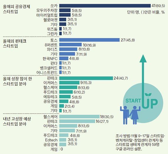 이는 스타트업 종사자들이 뽑은 올해의 공유경제/핀테크/성장한 분야/예상 스타트업 분야 등을 나타낸 그래프이다. 왼쪽에 나타난 스타트업들보다 훨씬 더 많은 공유 경제 스타트업들이 한국에 출범하고 있다. 공유 경제를 내세운 만큼, 소비자들에게 좋은 경험을 선사해주었으면 하는 바람이 크다.