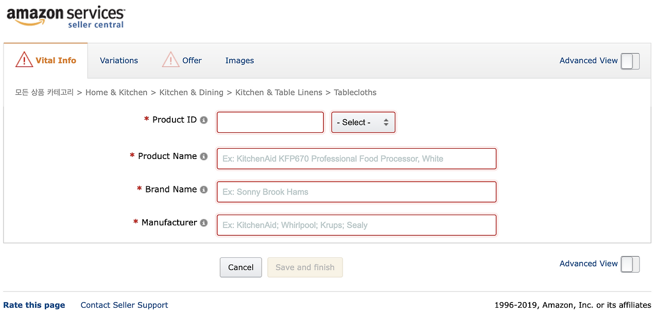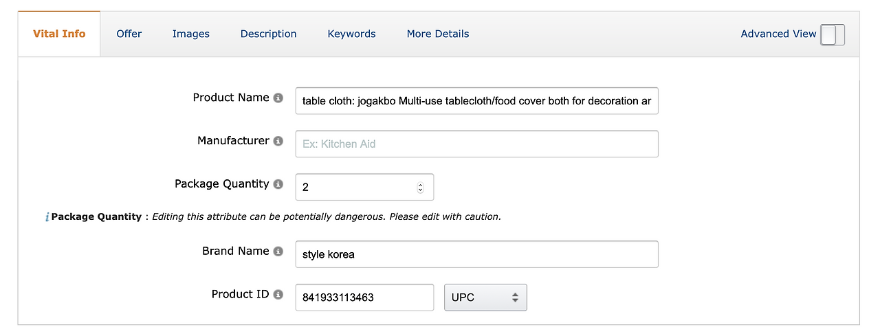 우리의 Vital Info 화면이다. Manufacturer를 적으면 우리의 Product Name 앞에 제조사 이름이 먼저 뜬다. 따로 안 적어도 상관은 없었다. 수량과 Brand Name, Product ID(다른 곳에서 긁어온 것)를 적어주었다. 여기서, Package Quantity가 굉장히 중요하다. 이는 제품 리스팅 관련 포스팅이 끝난 후, 우리의 실패 요인 중간 분석 포스팅에 대해 다룰 텐데 요약하자면 package quantity가 높을 수록 검색 상위 페이지에 노출될 가능성이 높아진다는 알고리즘을 직접 확인했다는 것이다. 그러므로 package quantity는 10개 이상 잡아두는 것이 좋을 것 같다. (이렇게 말했음에도 개수가 2개로 저장된 이유는, 현재 저 밥상보가 FBA 상품으로 등록되어 미국 아마존 창고에 있는 제품의 개수가 2개라는 이야기이다.)