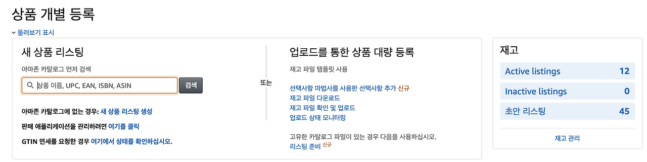 상품을 등록할 수 있는 방법은 크게 두 종류가 있는데, 개별 등록과 대량 등록 시스템이 있다. 제조사같은 경우 대량 등록 시스템을 이용하여 편리하게 물품을 리스팅할 수도 있지만, 나는 제조사가 아니기 때문에 대량 등록을 해본 적이 없다. 나와 같은 처지에 있는 분들이 대다수일 테니, 자연스럽게 왼쪽 칸을 보면 된다. 참고로, 저기 오른쪽에 활성 리스팅 12개이지만 초안 리스팅 45개가 되어 있는 것은 그만큼 실패를 많이 했다는 소리다. 상품 리스팅 단계에서 45개 이상의 오류들이 떴기 때문에 . . . 그냥 상품 리스팅이 힘들구나~라고 생각하고 밑의 포스팅들을 읽으면 공감이 될 것이라 생각한다.