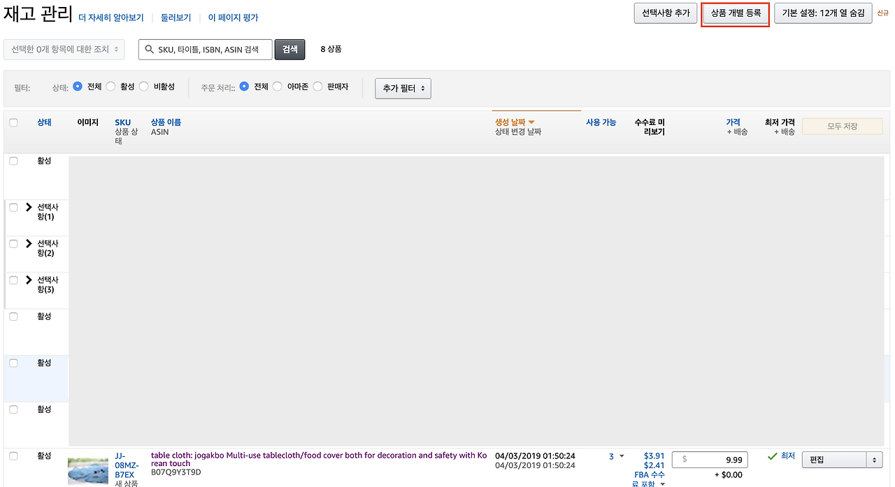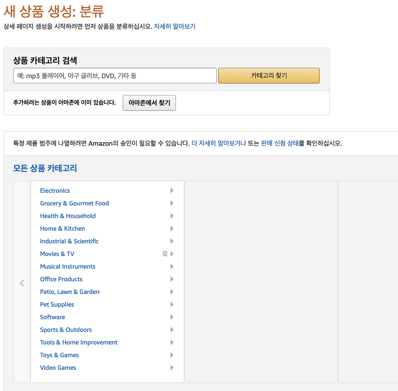 어찌됐건, 우리가 선택한 밥상보 제품은 ASIN 번호가 없는 제품일 뿐더러 아마존 카탈로그에도 없기 떄문에 [새 상품 리스팅 생성] 버튼을 눌러주었다.