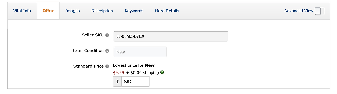 [Offer] 창을 보면, 이렇게 가격을 결정할 수 있는 창이 뜬다. 본래는 배송비도 따로 책정할 수 있으나, 우리의 상품은 FBA(쿠팡의 로켓배송과 비슷한 시스템)으로 등록되어 있기 때문에 $0.00 shipping 이라고 되어 있고 옆에 체크 표시(prime 딱지라고 부른다)가 있는 것이다. 그리고 저기 오른쪽 위 Advanced View 를 클릭하면 제조국 등의 상세 정보를 입력할 수 있는 칸이 나온다. 이를 클릭하면 조금 더 다양한 정보를 입력할 수 있다.