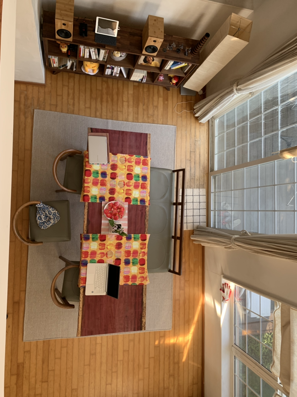 소파와 헤어지는 것을 두려워하는 남편이 걱정되기도 하고 실제 거실 분위기와 내가 상상하던 것이 어울리긴 할는지 우려의 마음도 있었는데, 우리 집 거실은 넓은 테이블과 책장 하나로 멋진 쉼터이자 놀이터이자 술터(?)로 완성됐다.