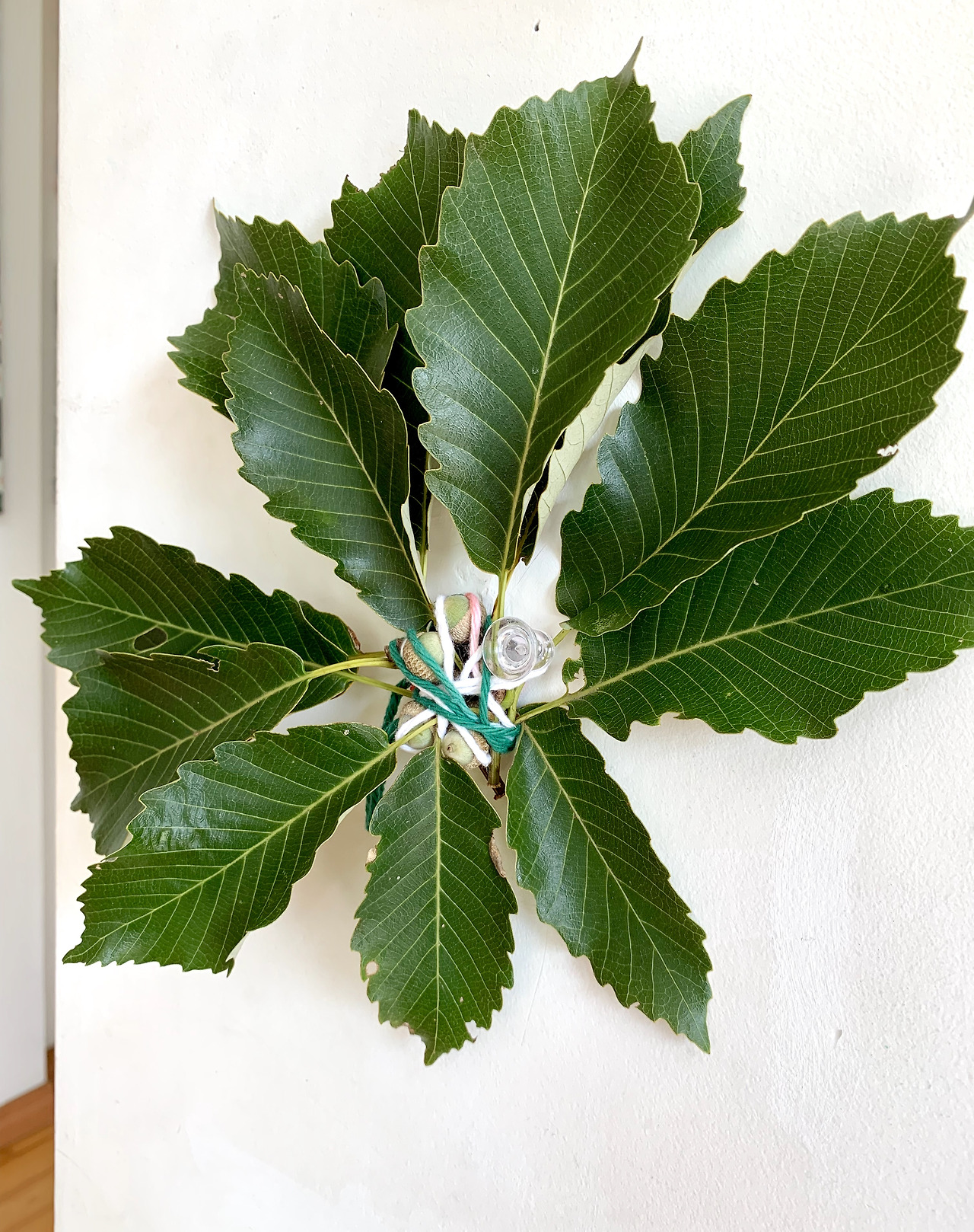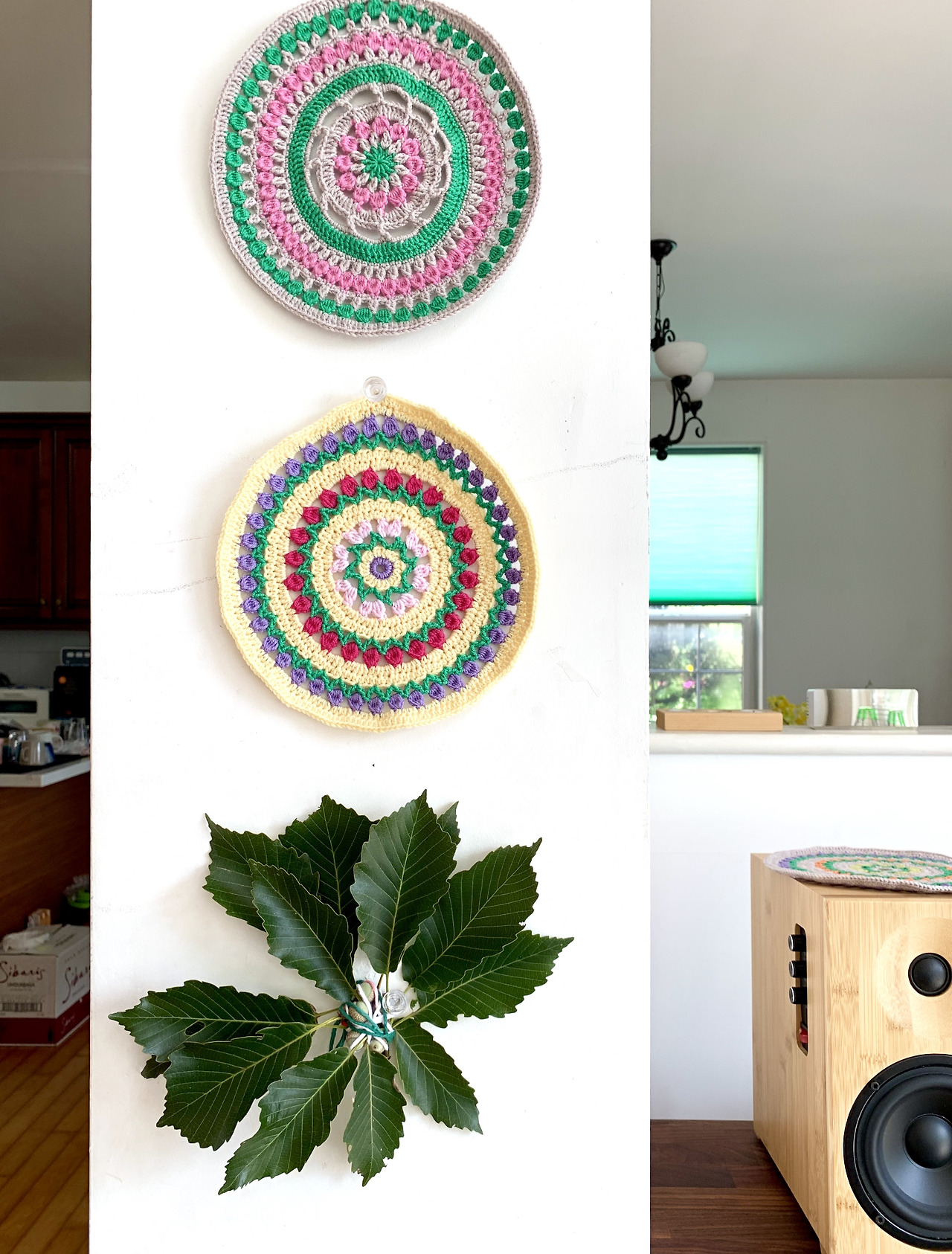 밥 먹고 산에서 내려오는 길에 주어 온 떡갈나무를 엮어 장식을 만들었다. 벽에 붙여 놓으니 제법 근사하다. 코바늘 만다라 뜨개와도 잘 어울린다.