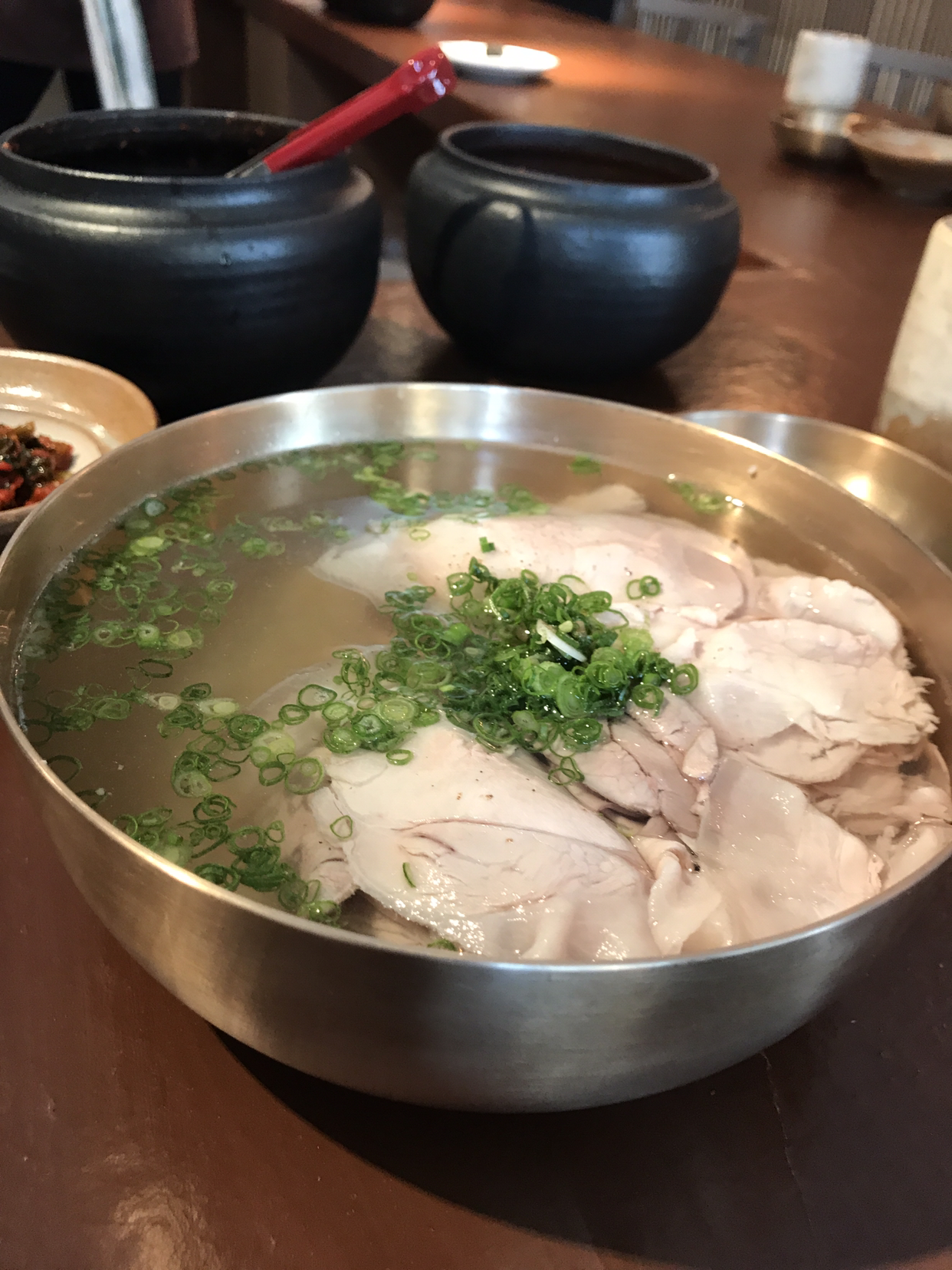 깍두기와 갓김치를 개인 접시에 담아 먹을 수 있고 고기를 찍어 먹는 장 (된장+청양고추에 약간의 조미를 한듯)을 앞접시에 담아 준다. 그리곤 밥이 말아진 돼지 곰탕이 나온다. 국물 맛 깔끔하다. 맑은 국이 시원하고 풍미가 있다. 밥이 보이지 않을 정도로 가득한, 얇게 저민 돼지고기를 장에 찍어 김치와 먹고 밥을 떠먹는다.