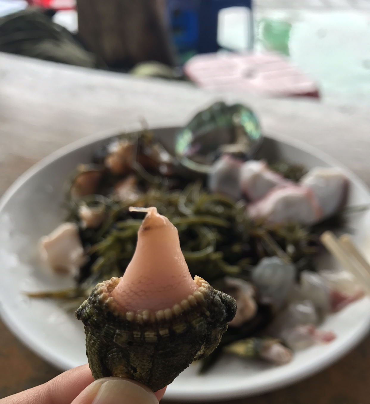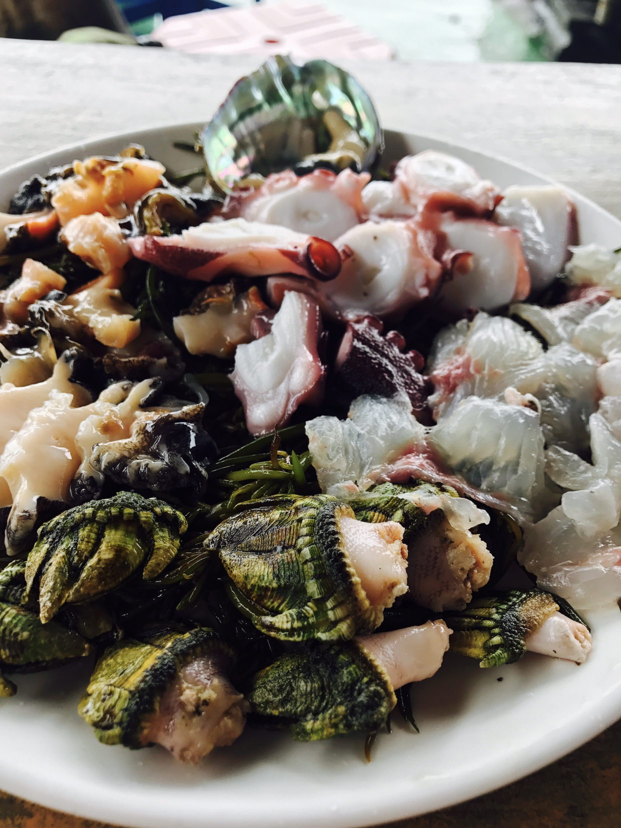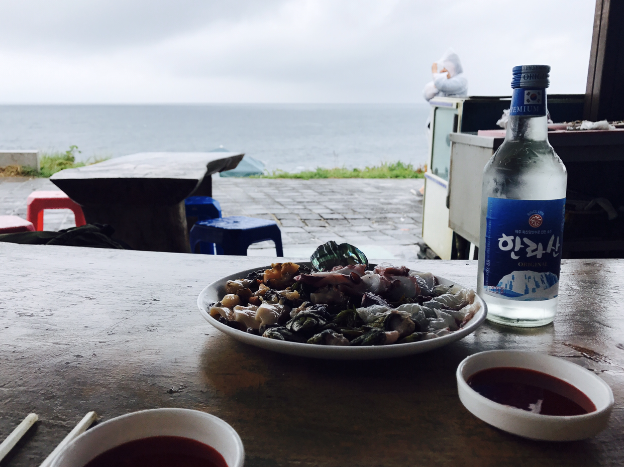 여유 있는 걸음으로 섬을 한 바퀴 돌고 늘어선 식당 가운데 한 곳에 자리를 잡았다. 바다가 눈 앞에 펼쳐진 식당에서 해물 짬뽕과 톳 짜장면, 그리고 해산물을 주문했다. 아침 9시 50분 배를 타고 갔으니 11시쯤에 아점을 먹은 셈이다. 해산물로는 멍게와 전복, 문어, 뿔소라, 거북손, 그리고 벵에돔이 나왔다. 제주스러운 구성이다. 한라산 한 병 보태었다. 기억에 남는 최고의 브런치 가운데 하나였다. 내가 좋아하는 음식들로 가득 상을 차렸고 바다 바람과 내음이 환상적이었고 한라산 한 잔이 혈관을 돌며 마음을 간지럽혔다.