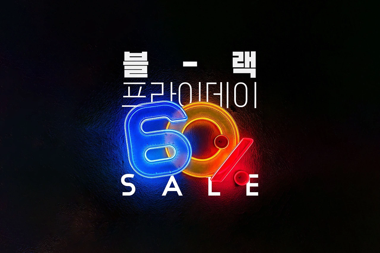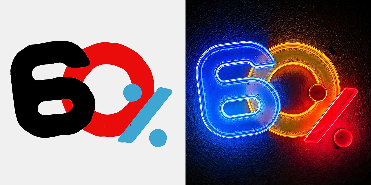 이 배너에서 “60%” 부분을 주목해 주세요. 과거에는 이러한 네온 효과를 전부 디자이너가 수작업으로 제작하였습니다. 당연히 일반인들은 엄두가 나지 않았죠. 그러나 이제 인공지능의 발달로 인해 글씨 혹은 로고에 이러한 효과를 간단하게 적용할 수 있는 길이 열리게 되었습니다. 이제부터 예제를 따라 하시면 됩니다. 어도비의 일러스트레이터와 어도비 파이어플라이를 사용하도록 하겠습니다. 현직 디자이너를 위한 내용이며, 어도비의 일러스트레이터를 다룰 줄 아는 것을 전제로 진행하도록 하겠습니다. 그러나 27장과 마찬가지로 디자이너가 아닌 분들도 포기하지는 마세요! 과정은 매우 간단하니까요.