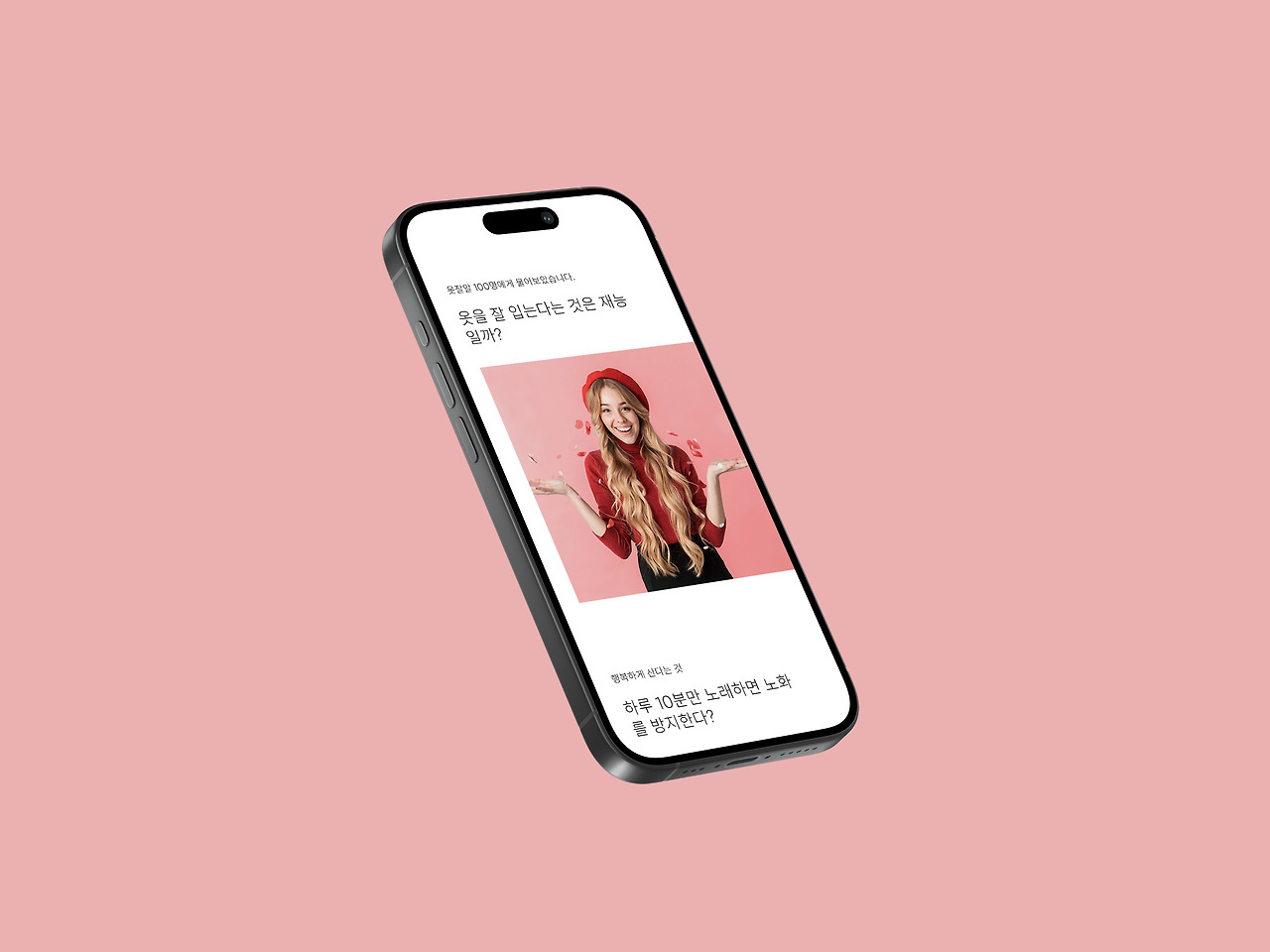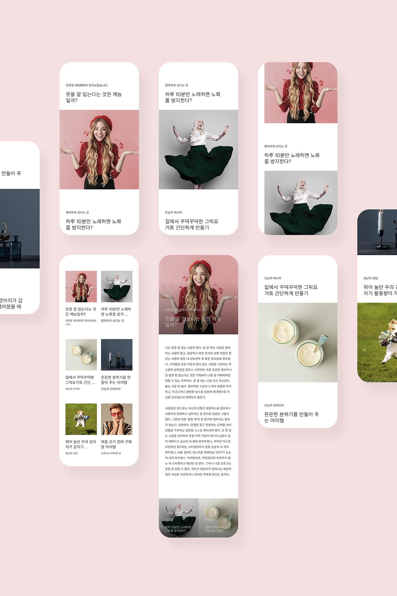 배경 컬러를 모델이 착용하고 있는 아이템과 같은 계열로 톤을 맞추어 색상 요소를 줄이고, 색종이 개수를 줄여 오브젝트를 보다 단순화, 또한 채도를 낮추어 보다 화사한 이미지에서 세련된 이미지로 전환.