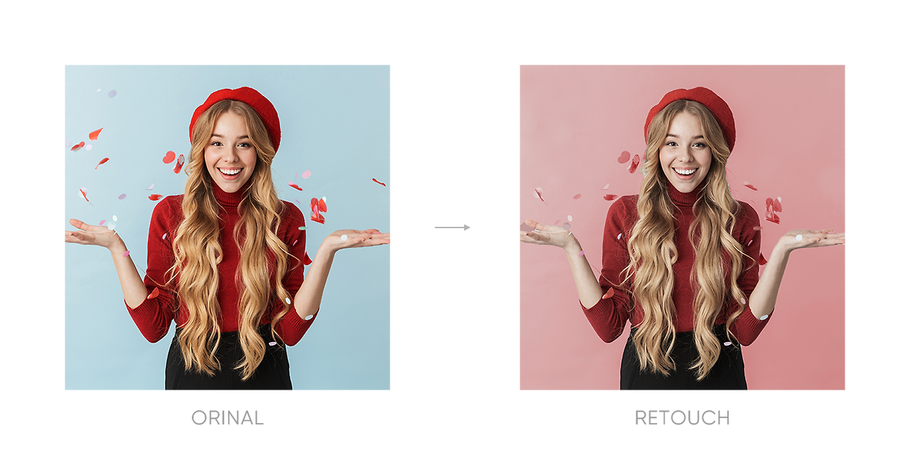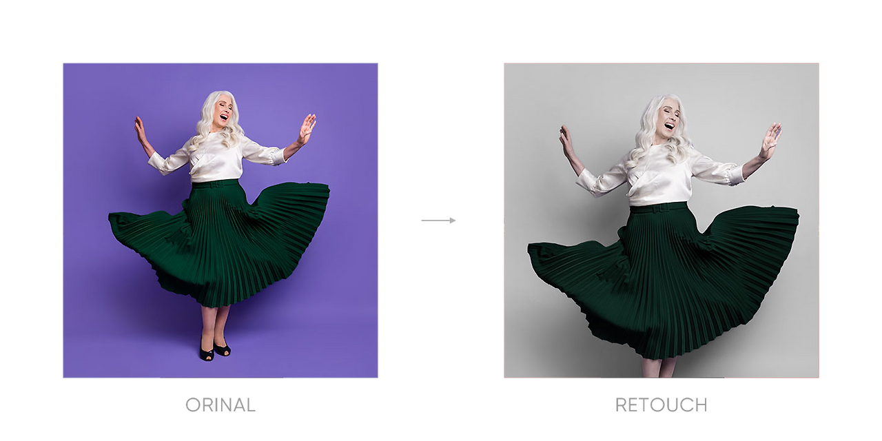 배경 컬러를 모델이 착용하고 있는 무채색 계열로 변경, 다리 부분 아래 구두가 꼭 필요하지 않으므로 크랍하여 단순화, 또한 배경 컬러에 맞고 피부톤도 채도를 맞춤.