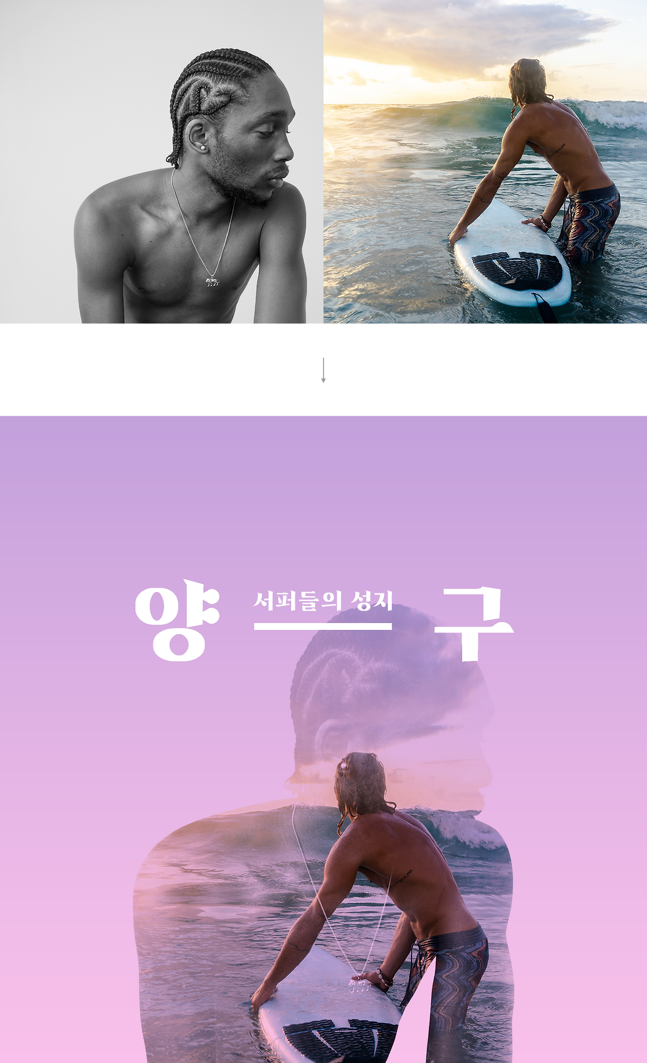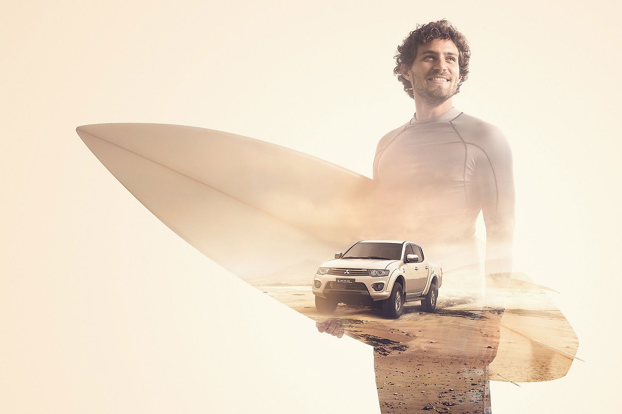 위의 이미지를 보시면 자동차가 해변을 달리는 모습을 남자서퍼의 실루엣으로 마스킹 처리를 한 것을 볼 수 있습니다. 이 기법을 쓰면 카피 영역도 확보되고 여백을 많이 두어 좀 더 세련된 연출이 가능합니다. 더블 익스포저 기법의 튜토리얼은 글 하단에 기입하기로 하고 저는 우선 같은 기법으로 이미지를 하나 제작하면 아래와 같은 이미지를 만들 수 있습니다.