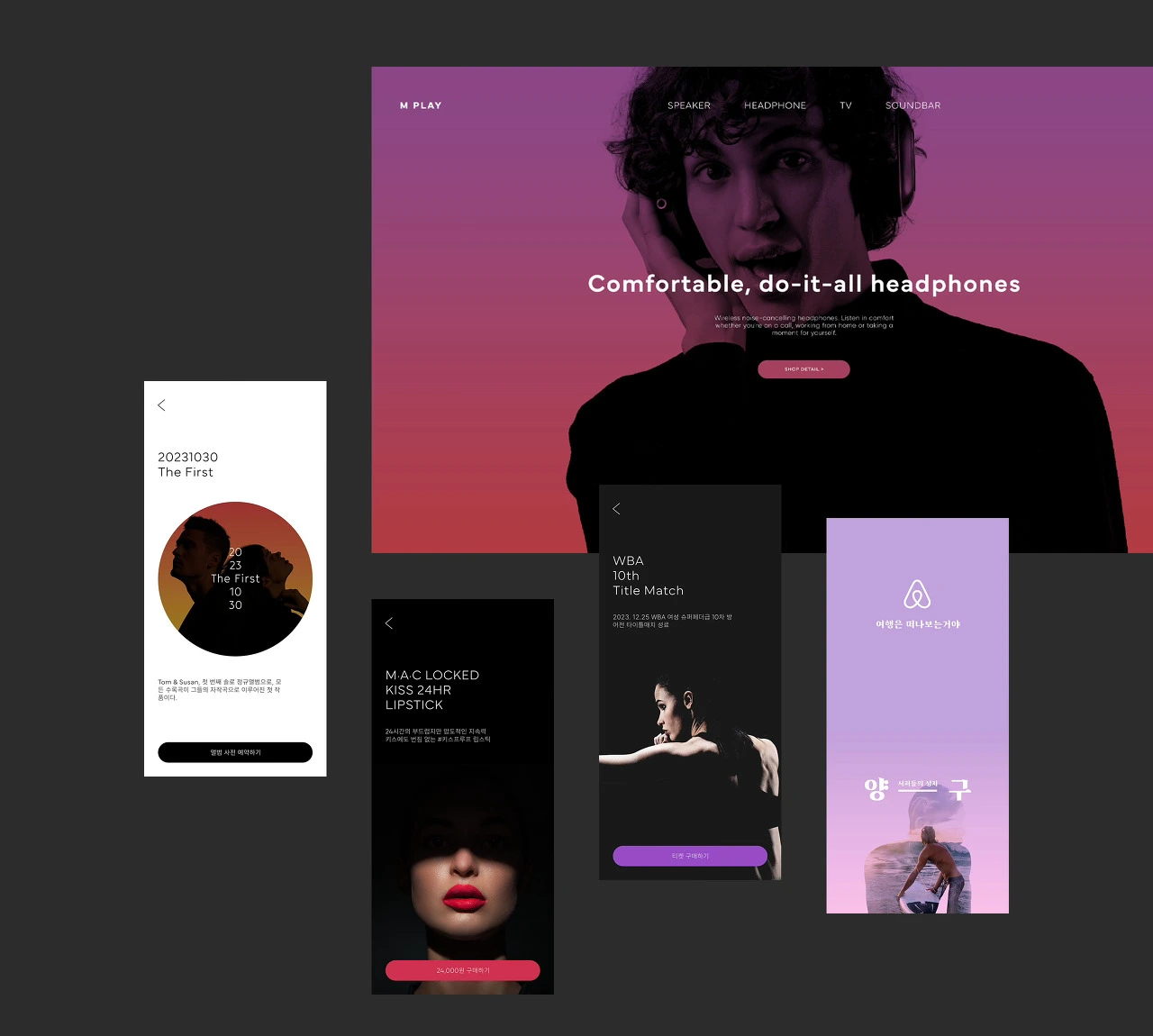 이렇게 실루엣과 듀오톤의 활용방법과 사용 목적에 대해 정리해 봤습니다. 이번차에서 제작된 기법의 이미지들은 한 페이지에서 한꺼번에 많은 양을 보여주는 것보다는 한 페이지에 한두 컷 정도 소수로 사용할 때 적합합니다. 이미지 하나하나가 명도가 어둡거나 채도가 높기 때문입니다. (눈이 아픕니다). 모바일 스플래시 혹은 빅배너 등에 사용하면 좋습니다. 이번 차 이미지 제작 기법으로 적용한 시안 사례들은 아래와 같습니다.