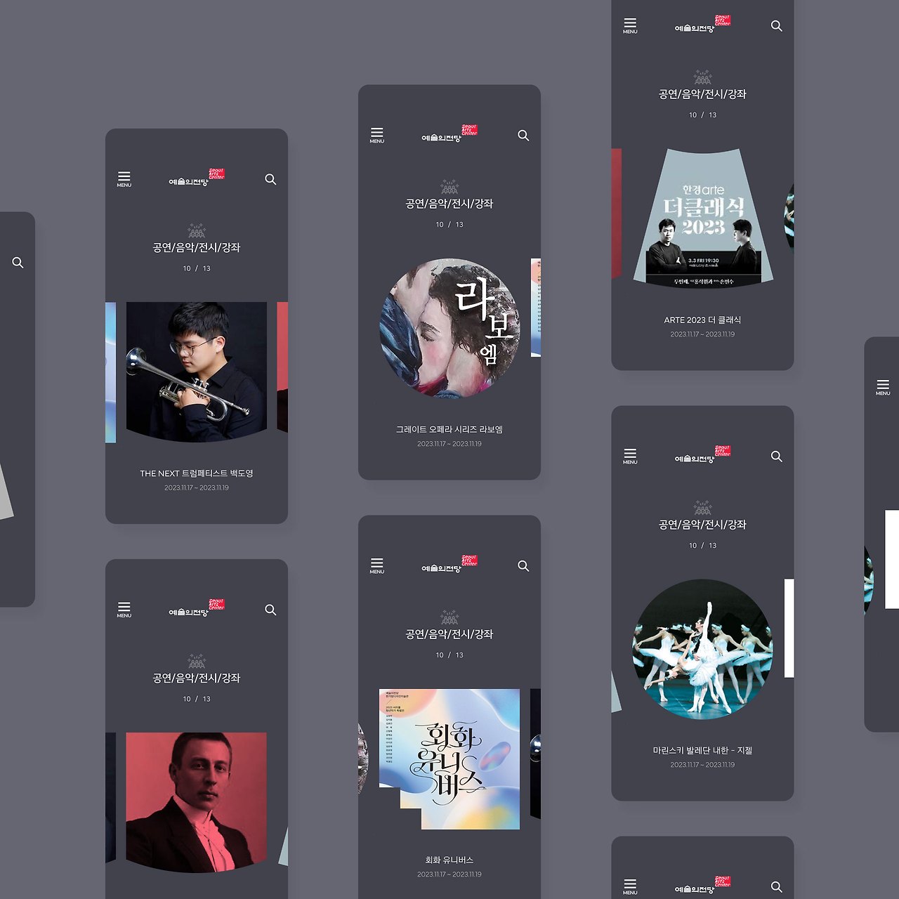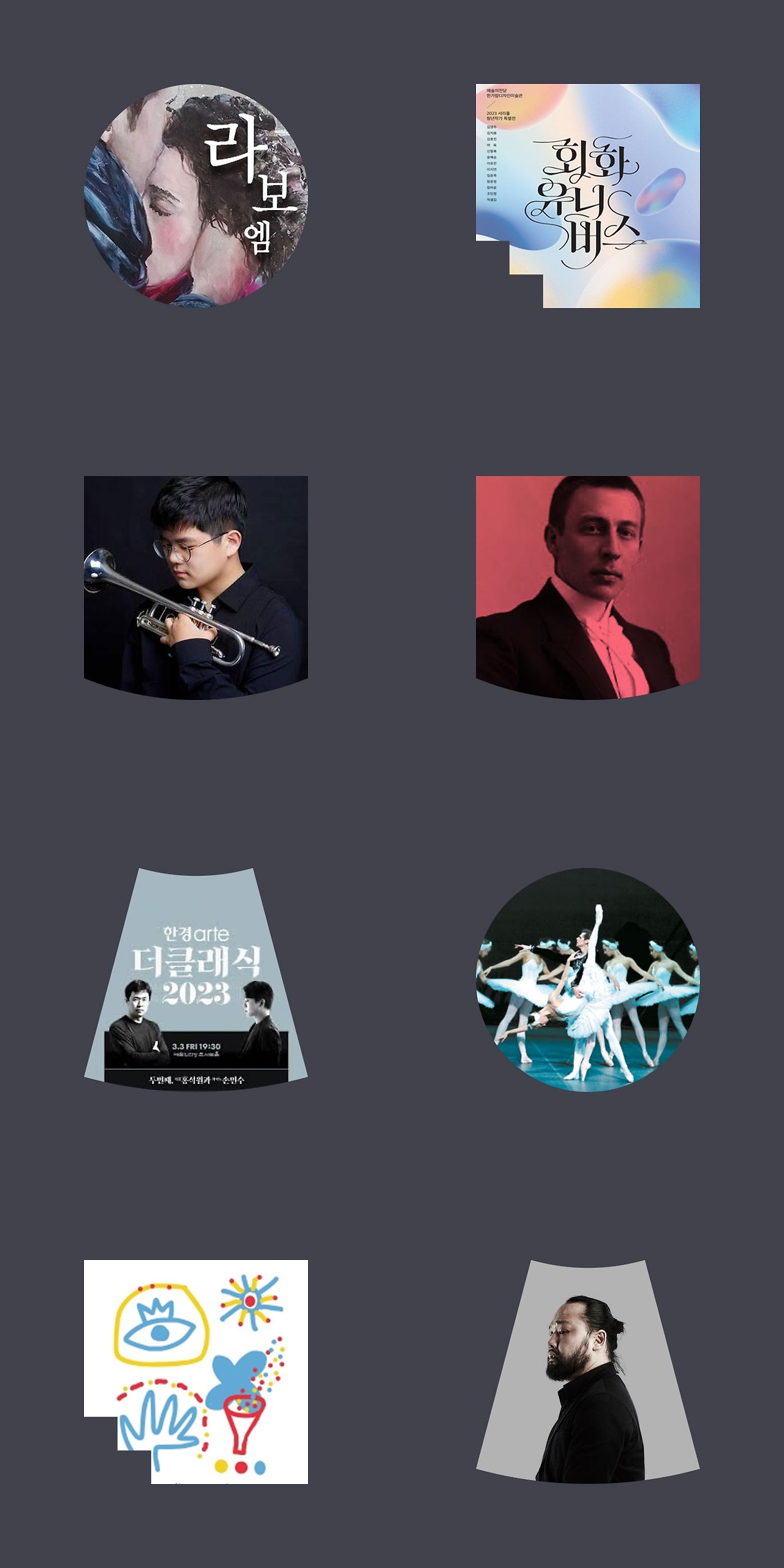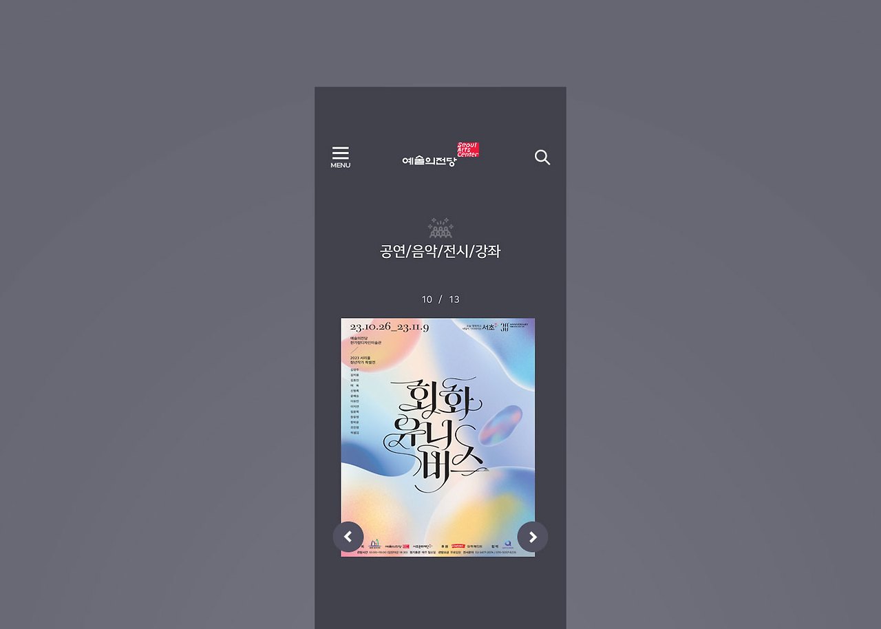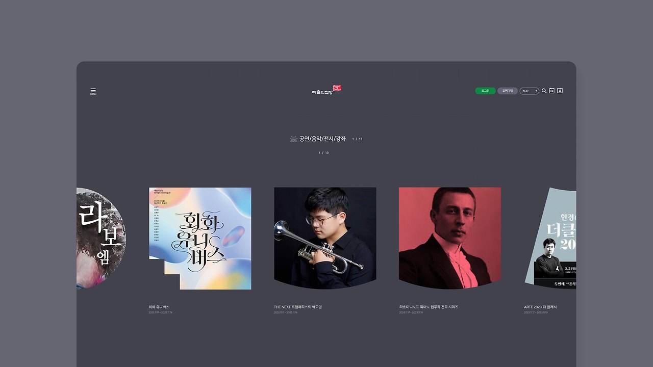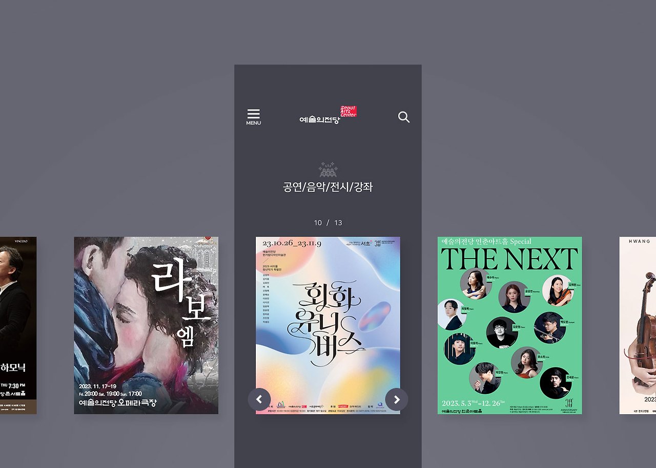 아래의 컷은 예술의 전당 모바일 메인 페이지 코너 중 공연/음악/전시/강좌 코너를 소개하는 영역입니다.