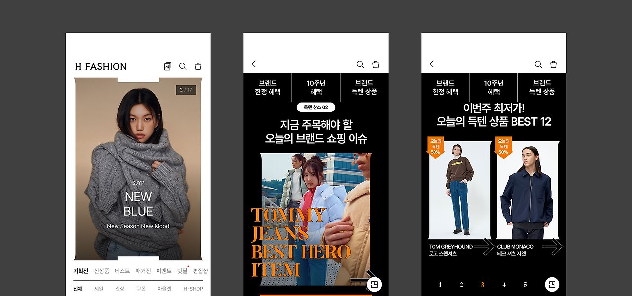 그리고 UI 주요 페이지입니다. 비율이 조정되고, "H" 중앙의 움푹 파인 부분도 채워지기도 했지만, 기본적으로 심벌마크의 형태로 마스킹한 것을 볼 수 있습니다. 이렇듯 차별화는 무언가 큰 차이를 내는 것이 아닌 아주 작은 것부터 시작합니다. 그리고 그 차이를 발생시키는 것 중에 바로 그래픽 모티브가 있습니다.