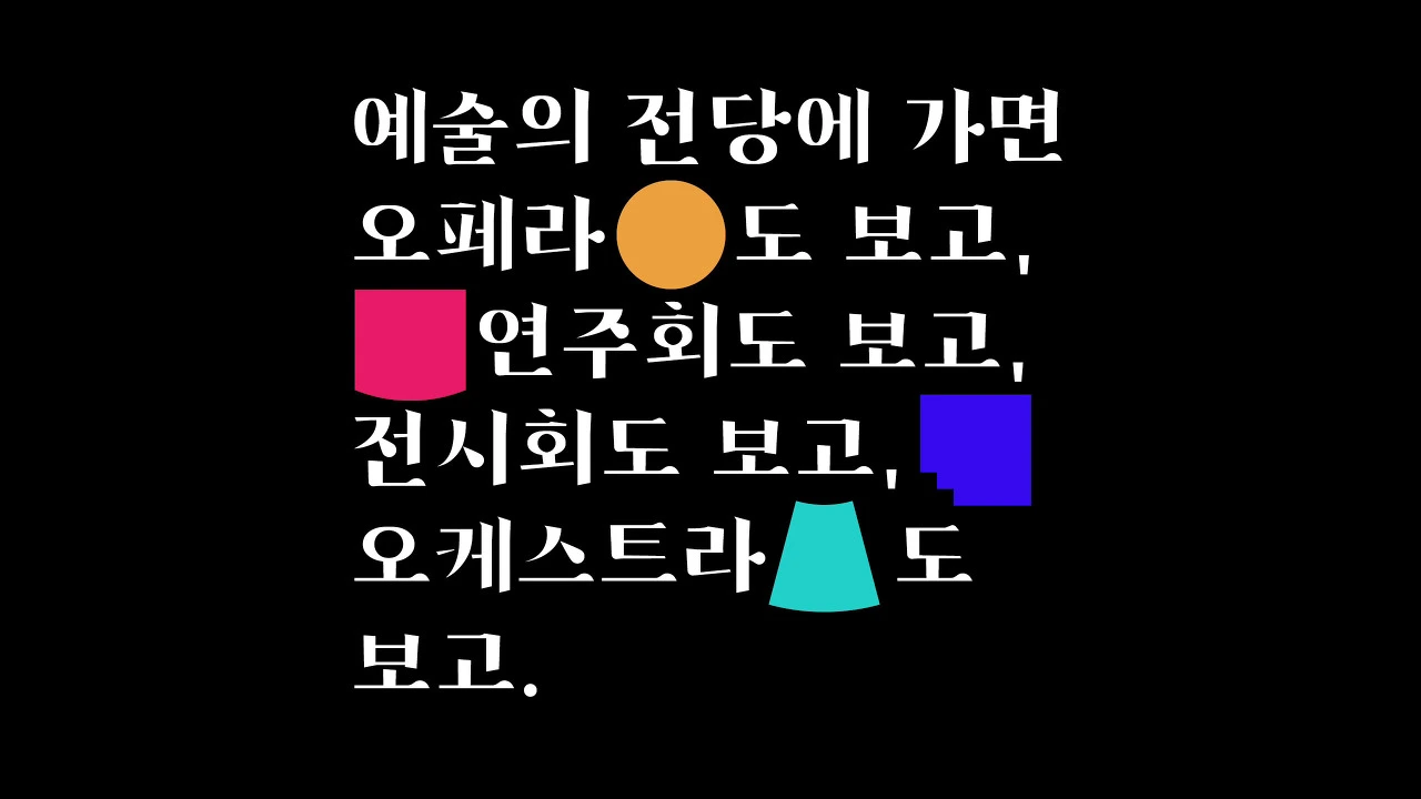 위의 코너의 썸네일 배너는 모두 같은 형태를 지니고 있습니다. 바로 사각형입니다. 저는 그래픽 모티브를 이용하여 공연/음악/전시/강좌가 형태만으로 구분되도록 만들어볼까 합니다. 예술의 전당은 성격에 따라 전용 건물이 나누어져 있습니다. 이 건물들의 역할은 이렇습니다.