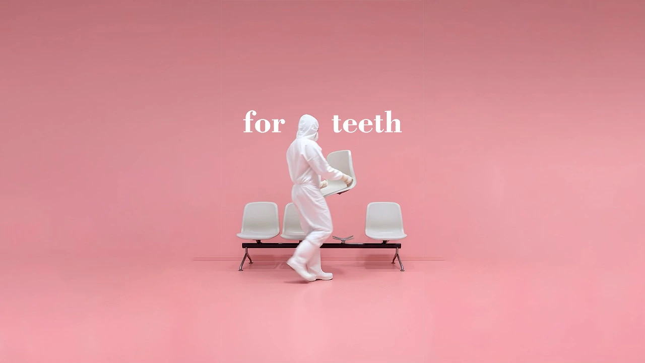 camera is fixed. A person in white protective gear holding a long, human-sized dental mirror appears from the left, examines the underside of the chair with the dental mirror, and then disappears to the right.