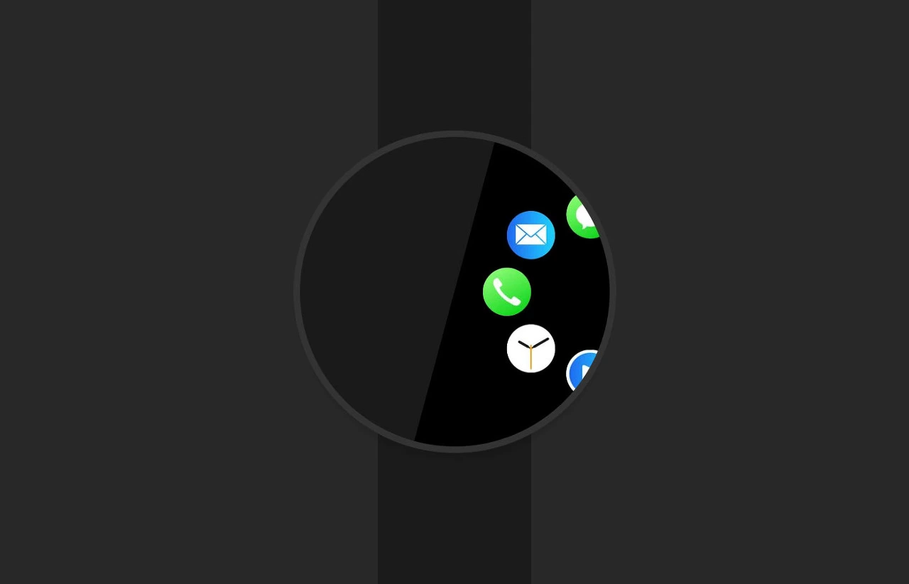 너무나 당연하게도 원형의 디스플레이 안에 원형 아이콘이 어울리고, 원형의 그리드가 어울립니다. 아래 이미지를 보시면 아이콘들이 움직이는 선의 기준은 원형 그리드 시스템의 영향을 받고 있습니다.