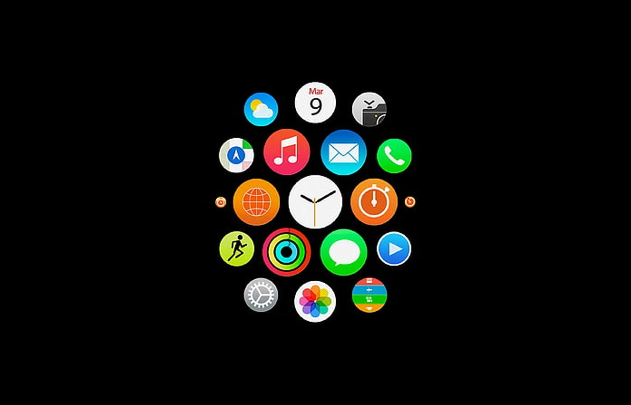왜 원 모양의 런처 아이콘으로 구성되었을까요? 그리고 저 배치는 어떤 기준으로 배치가 된 것일까요? 바로 효율성 때문입니다. 원 모양의 디스플레이에서 사각형등의 아이콘을 사용할 경우 유실되는 영역이 많습니다. 쉽게 말하면 낭비되는 영역이 많다는 뜻입니다. 이 비효율을 막기 위해 애플이 선택한 방법은 원 모양의 아이콘과 방사형 레이아웃의 적용입니다. 아래 이미지를 통해 중앙을 중심으로 방사형으로 차차 퍼지고 있는 그리드를 확인하실 수 있습니다.