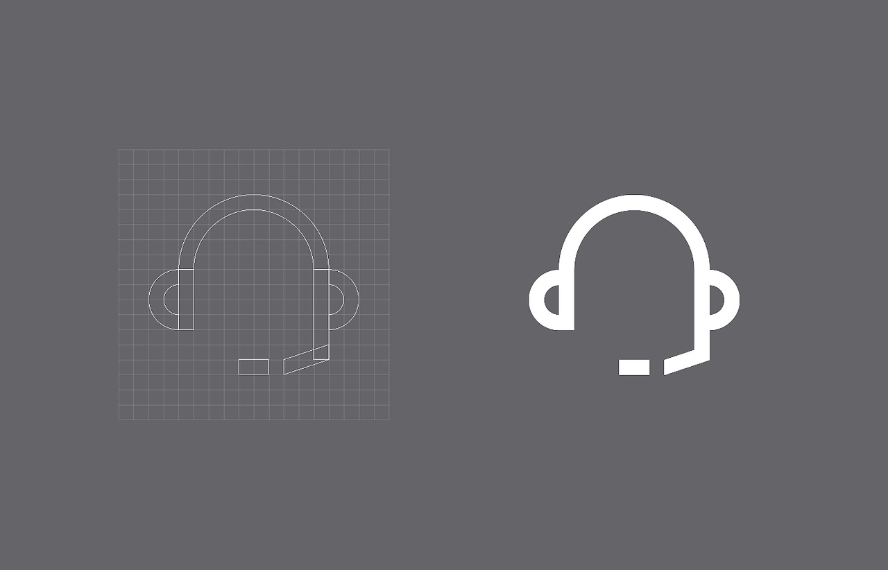 샘플 3. 헤드셋(고객센터)입니다. 7개의 요소를 조립하였습니다. 이 아이콘은 원을 대체하여 반원이 사용되었습니다. 이렇듯 시인성을 위해 원을 반원(180도 부채꼴) 혹은 1/4 원(90도 부채꼴)을 사용하여도 무방합니다.