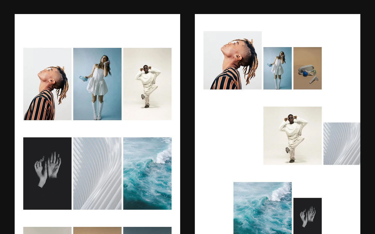 오랜 시간 동안 많은 디자이너들과의 커뮤니케이션을 통해 느낀 점 중의 하나는 자유로운 레이아웃이라는 권한을 주었을 때 오히려 제작을 힘들어한다던가, 아니면 일정 기준이 없어 어려워하는 경우를 자주 겪곤 했습니다. 그런데 이 자유로운 레이아웃이라는 개념이 사용된 곳이 생각보다 굉장히 많습니다. 이커머스의 룩북, 매거진은 물론 개인 포트폴리오, 미술관 전시 소개 화면등에서 특히 자주 쓰입니다. 바로 아래 이미지와 같은 경우를 예로 들 수 있습니다. 이런 형태를 범용적으로 Freeform 레이아웃이라는 용어로 불립니다.