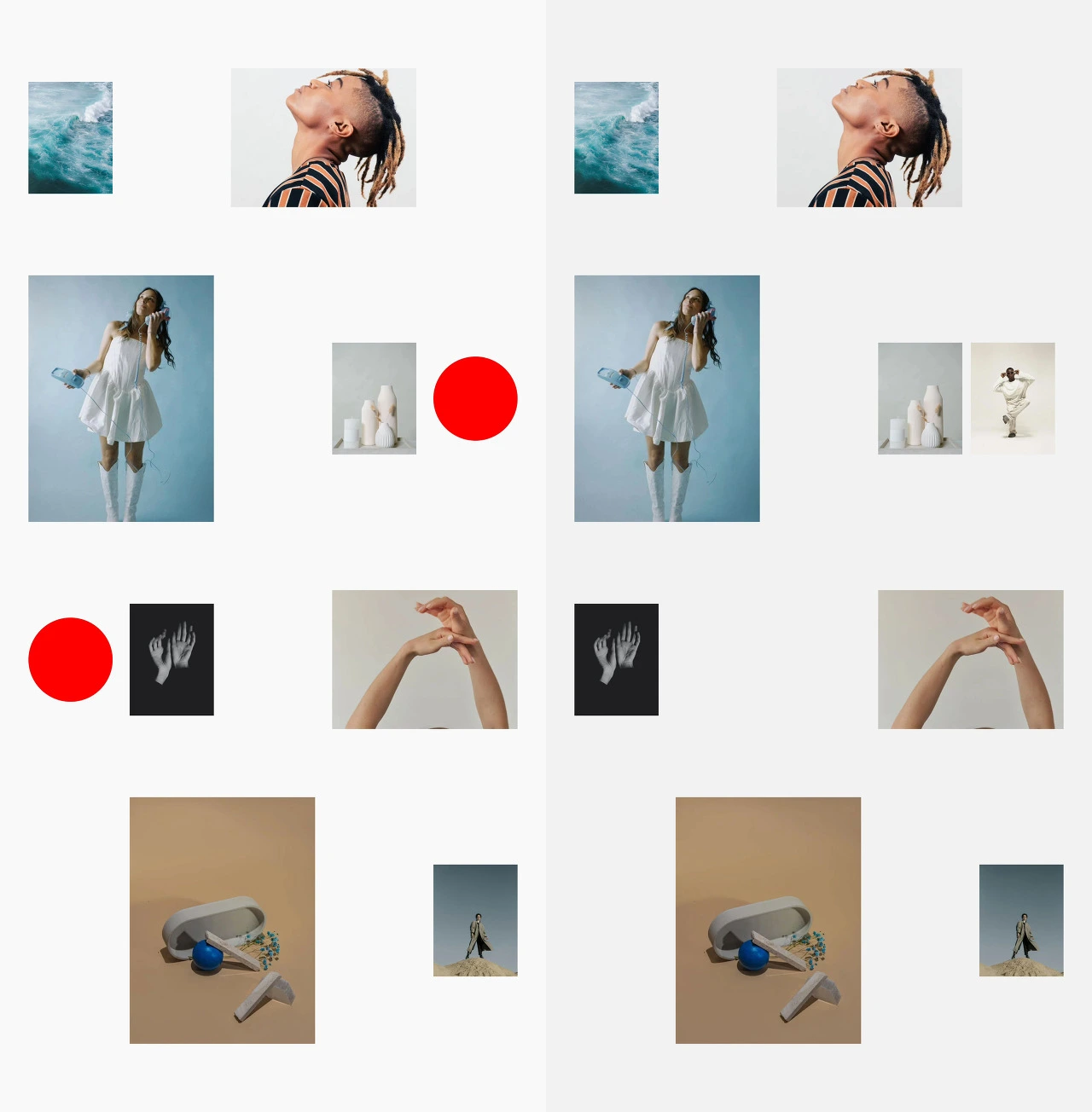 보조 이미지의 y좌표 값을 변형할 수 있습니다. 주 이미지를 기준으로 하여 중앙이 아닌 위쪽 정렬, 하단 정렬, 혹은 거터값(60px의 배수)을 활용하여 간격을 만들어 배치해 줍니다.