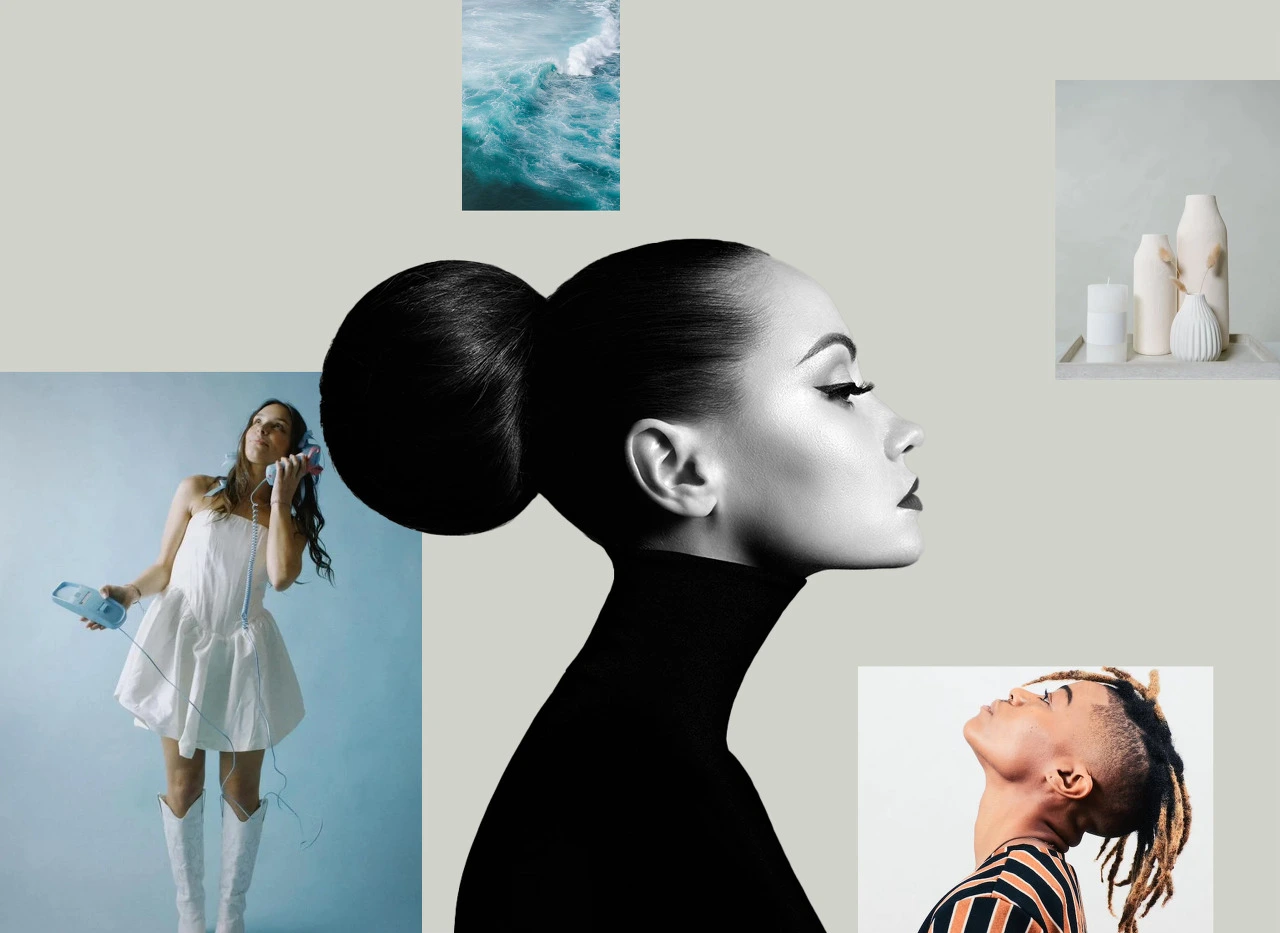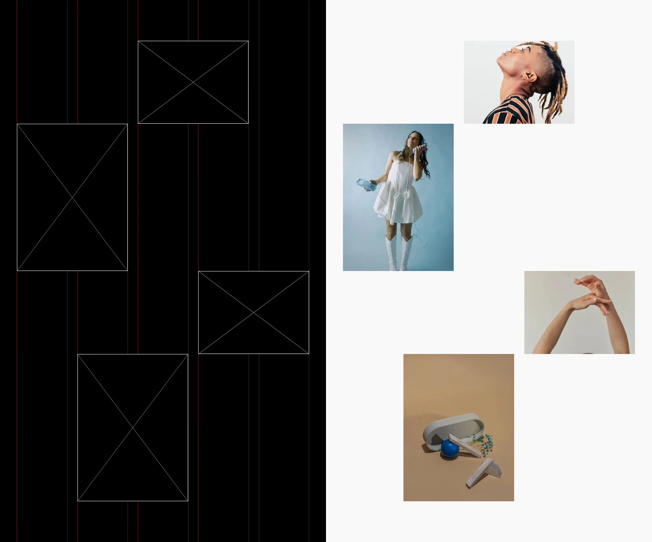 먼저 중심축을 만들겠습니다. 4장의 이미지(4:3 비율 2장, 3:4 비율 2장)를 5 분할 그리드 중 2 분할 넓이를 활용하여 시작점(붉은 선)이 겹치지 않도록 배치해 줍니다. 배치는 자율이며 같은 붉은 선에 두장 이상의 이미지가 시작점이 겹치지 않도록만 해주세요. 이 이미지를 "주 이미지"로 명칭을 정하도록 하겠습니다.