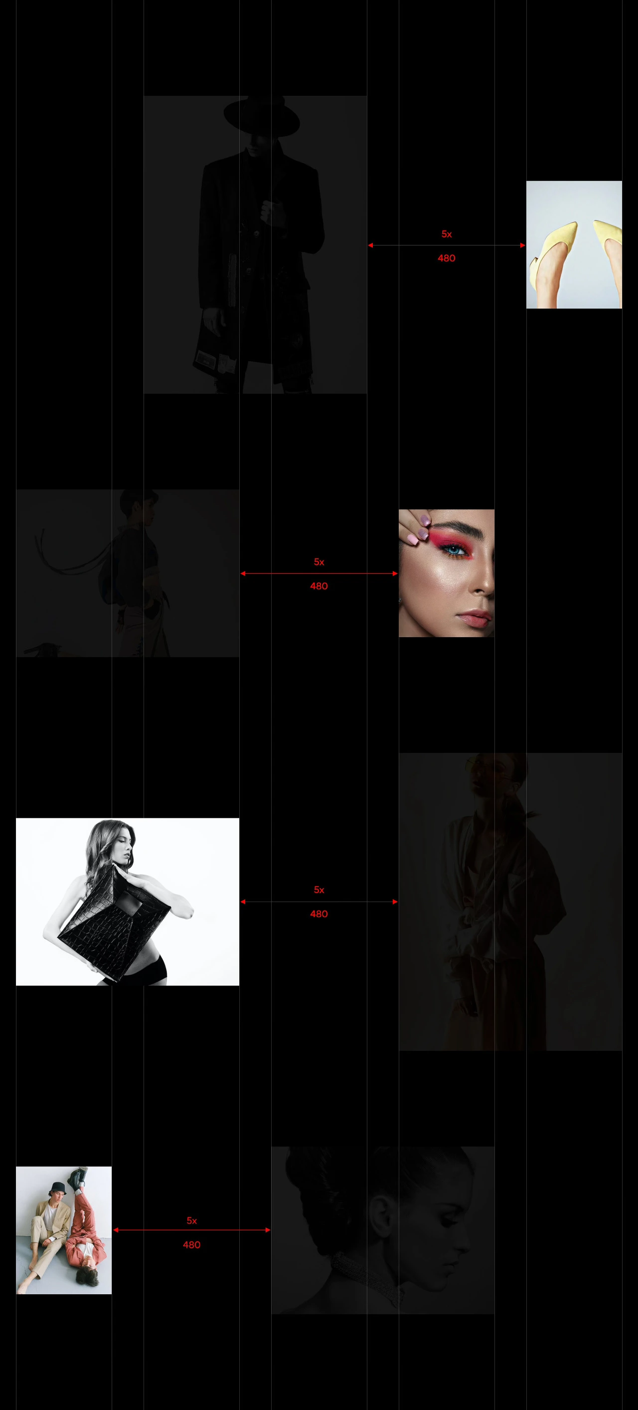 그럼 위의 그리드에 맞춰서 이미지를 배치해보도록 하겠습니다. 지난 시간에 언급한 것처럼 메인 이미지를 세로로 배치해 줍니다. 이전 회차의 경우와 동일하게 3:4, 4:3 이미지만 사용하겠습니다. 이미지의 세로 간격은 "3x(288px)"로 설정해 주었습니다. 이 간격 또한 자율이지만 제약이 있습니다. "x(96px)"의 배수로 설정해 주세요.