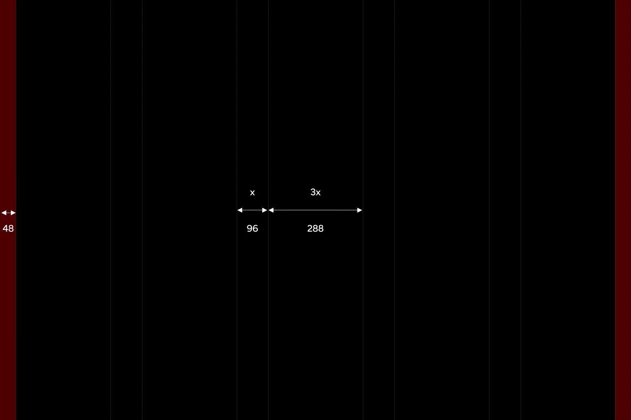 결론은 아래와 같은 그리드 시스템을 만들 수 있습니다. 이때 여백은 자율입니다. 저는 8의 배수를 지키기 위해 48px을 여백으로 설정하였습니다. (당연히 여백값을 높이면 거터와 분할면은 줄어듭니다.)