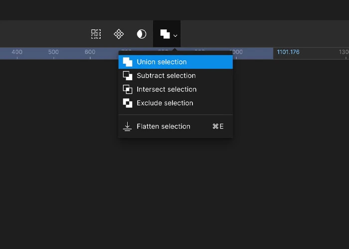 위의 4개의 도형을 한꺼번에 선택한 상태에서 상단 중앙의 Boolen Groups(사각형 두 개가 합쳐진 모양의 아이콘)의 오른쪽 확장 화살표를 클릭하여 Union Selection(영역 합치기)을 클릭하여 주세요.