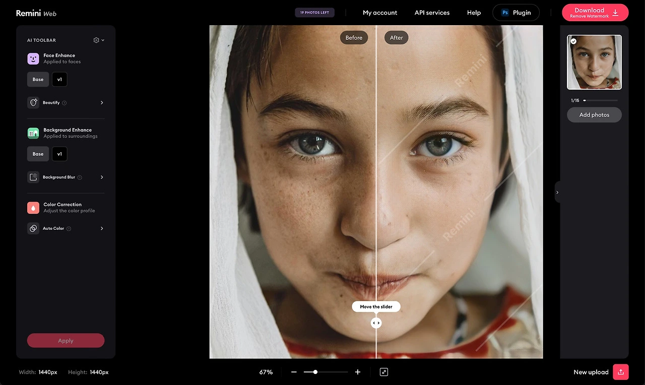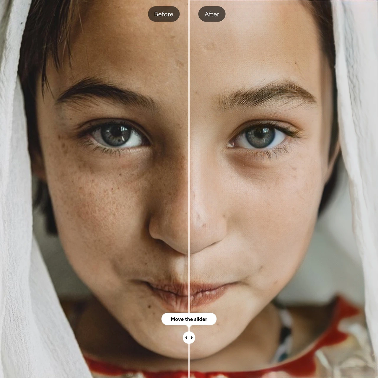 이때 가운데의 "Move to slider"를 누른 채로 좌우로 이동하면 개선 전후를 자세하게 볼 수 있습니다.