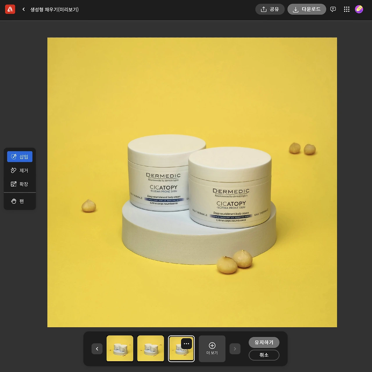 4. 이후 아래 메뉴의 “생성하기”버튼을 클릭합니다. 그럼 브러시로 지운 부분에 마카다미아 열매가 배치된 것을 미리 보기로 확인이 가능합니다. 또한 추가로 두 개의 이미지가 더 생성되어 있는 것을 아래쪽 썸네일에서 확인하실 수 있습니다. 마음에 드는 이미지를 윗부분의 다운로드 버튼(화살표가 위로 향해 있는 버튼)을 클릭하여 다운로드하시면 끝입니다. 세 개의 이미지가 마음에 들지 않는다면 “더 보기” 버튼을 클릭하여 새로운 결과물을 계속 생성할 수 있습니다. 원하는 결과물이 나올 때까지 계속 시도하시면 일반적으로 5차례(총 15장) 이내에 근삿값을 얻을 수 있을 것입니다.