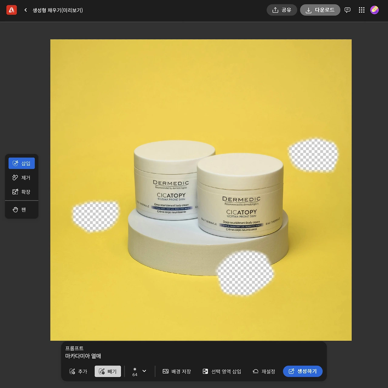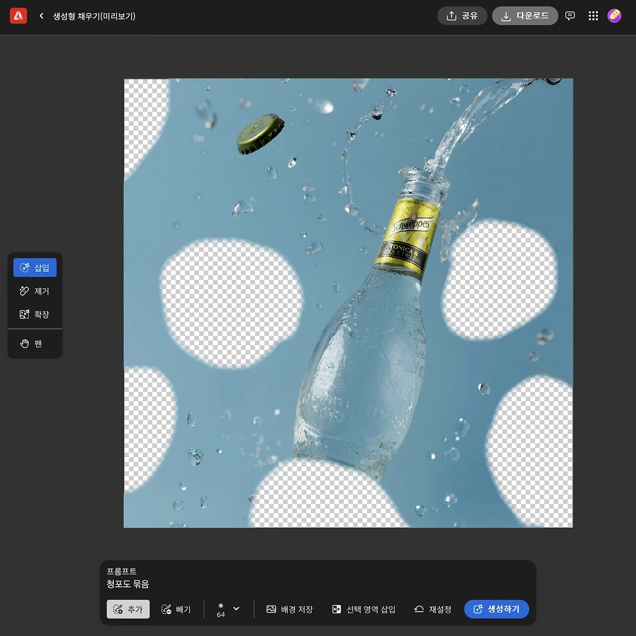 Firefly의 “생성형 채우기” 기능 중 “삽입”은 요소를 추가하거나 요소를 교체하는 용도로 사용하실 수 있습니다. 이 기능은 넓은 범위보다는 작은 범위에 적용했을 경우 더 완성도가 높은 결과물이 생성됩니다. 티는 안 나지만 아주 작은 부분을 추가하거나 교체할 때 사용해 보세요. 다음 장에는 “확장”기능에 대해서 예제를 통해 따라 해 보는 내용으로 찾아뵙도록 하겠습니다. 읽어주셔서 감사합니다.