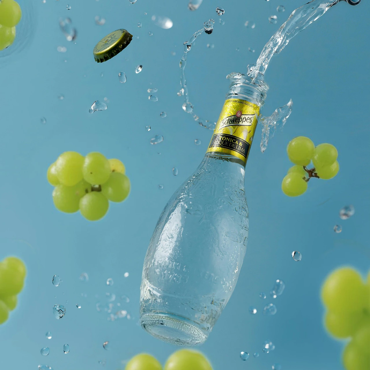 탄산수를 파는 쇼핑몰입니다. 레몬음료에 이어 청포도 음료를 새롭게 출시하였습니다. 음료수 병 주변으로 레몬이 배치되어 있는 사진을 활용하여 청포도로 교체할 수 있을까요?