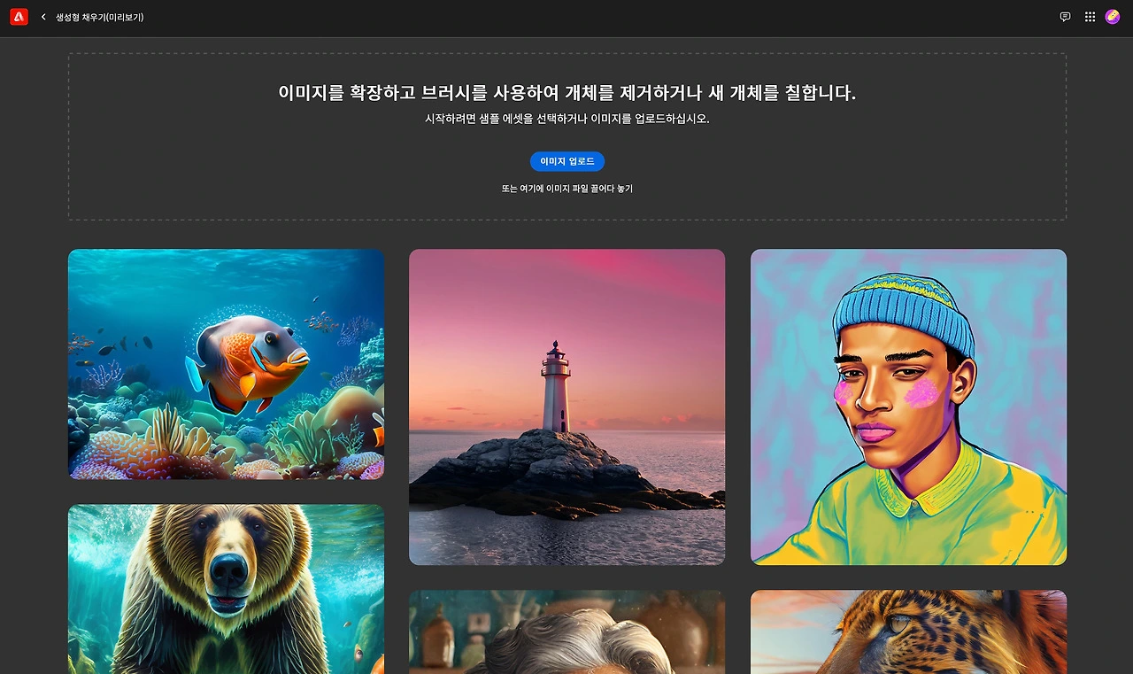 2. 생성형 채우기(미리 보기)를 클릭한 이후 보이는 시작 화면입니다. 이 화면에서 아래의 이미지들은 대략적인 원리를 알려주는 예시들입니다. 우리는 “이미지 업로드”버튼으로 시작하면 됩니다. 우리는 “이미지 업로드”버튼으로 시작하면 됩니다. 여기까지는 이전 장의 과정과 동일합니다.