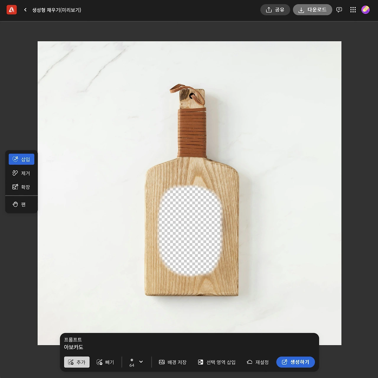 2. 첫 번째와 동일한 과정으로 진행합니다. 목적은 도마 위의 토마토 대신 아보카도를 삽입하는 것입니다. 그래서 저는 아보카도를 가운데에 위치하고자 가운데 토마토 부분을 브러시로 문질러 주었습니다. 영역 선택을 완료한 후 이미지 아래의 프롬프트에 “아보카도”를 입력해 줍니다.