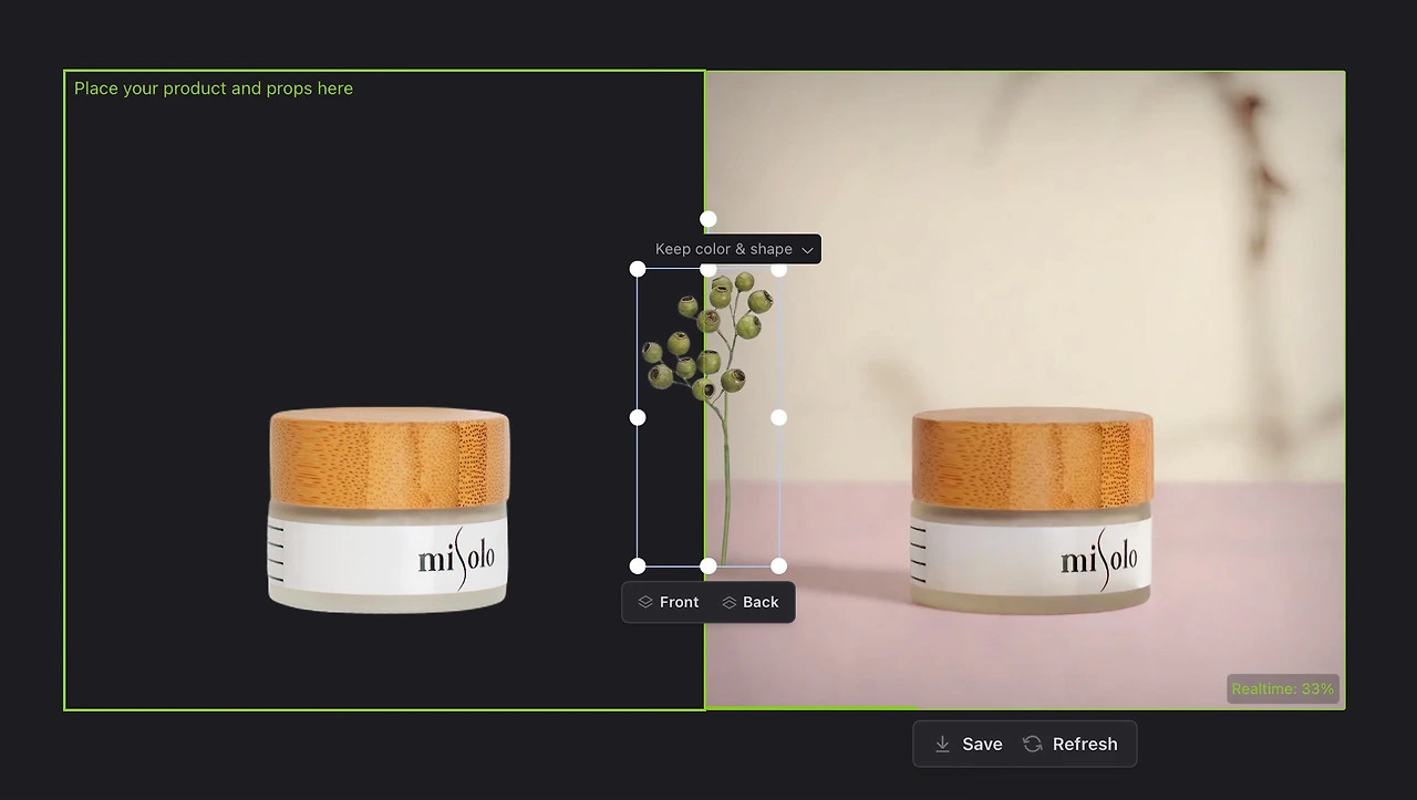 이때, 장식 요소를 클릭한 상태에서 “Back”을 누르면 화장품의 뒤로 이동합니다. 그에 맞게 배치를 바꾸면 됩니다.