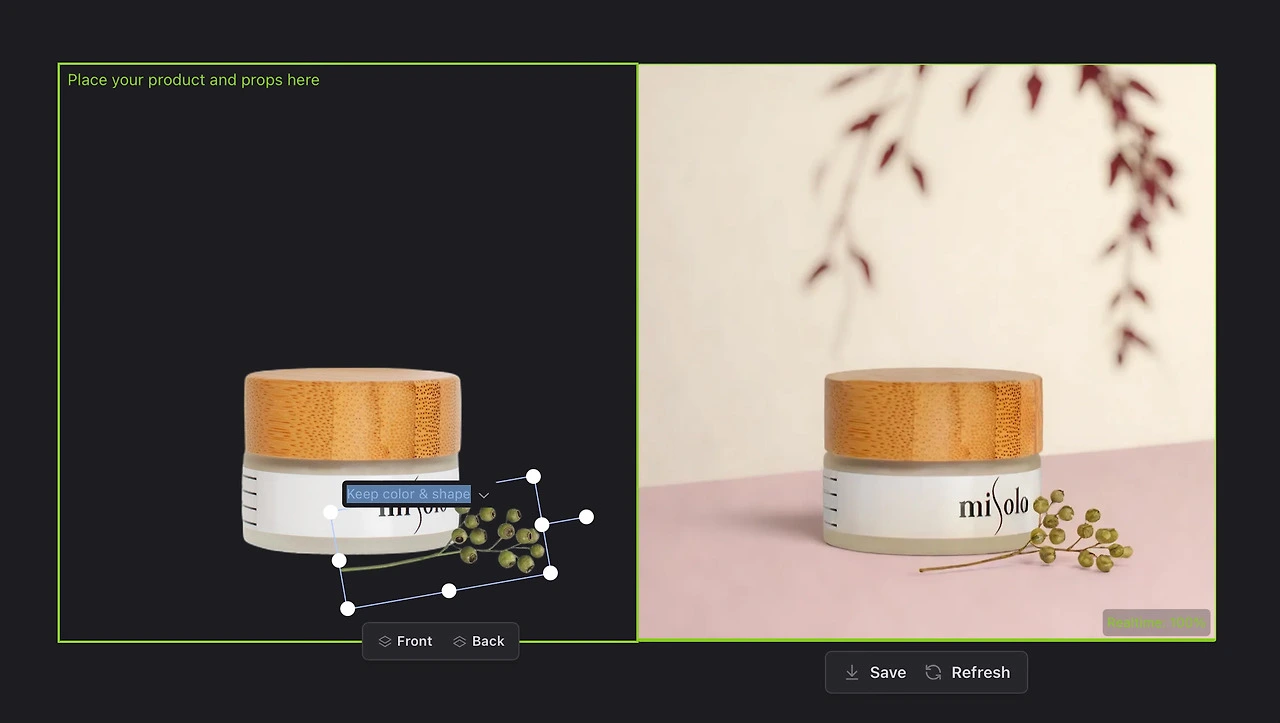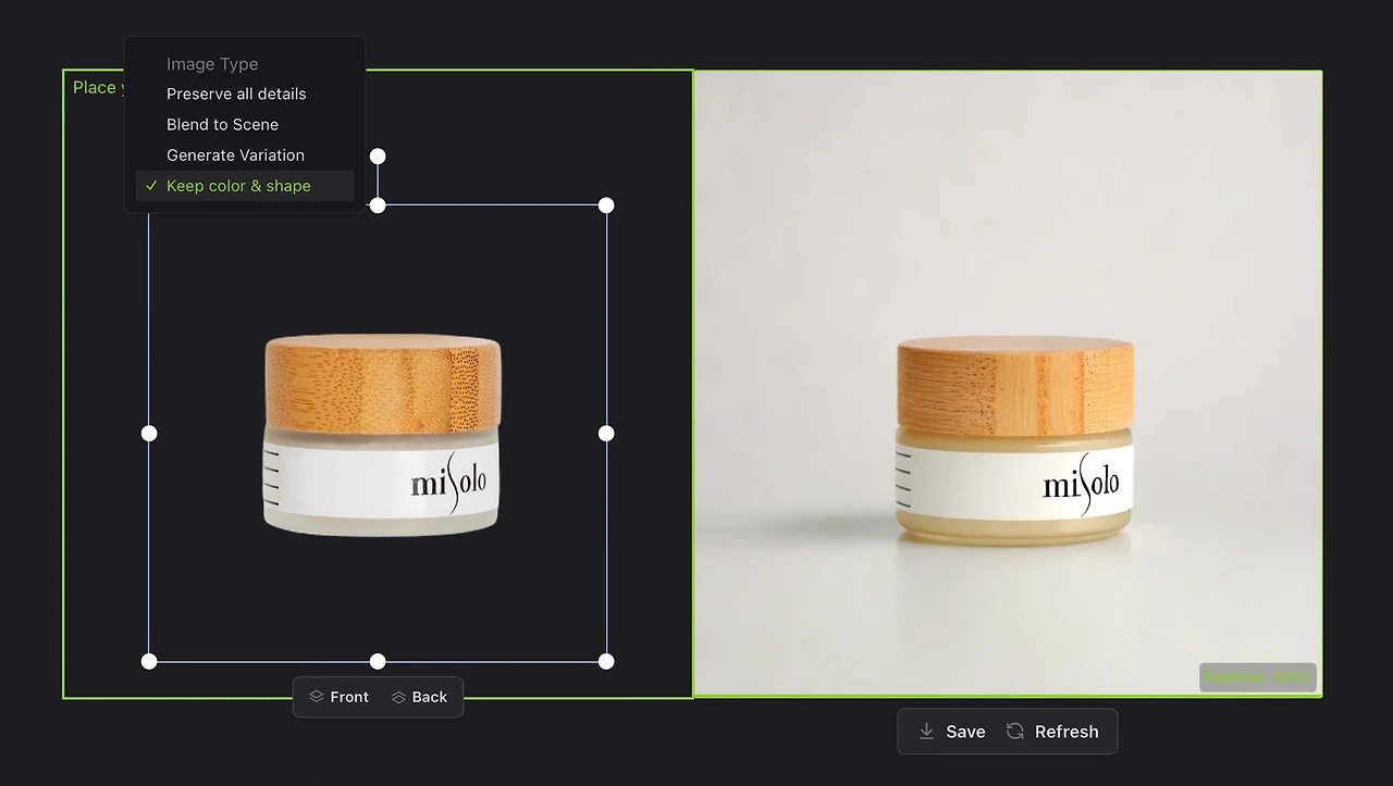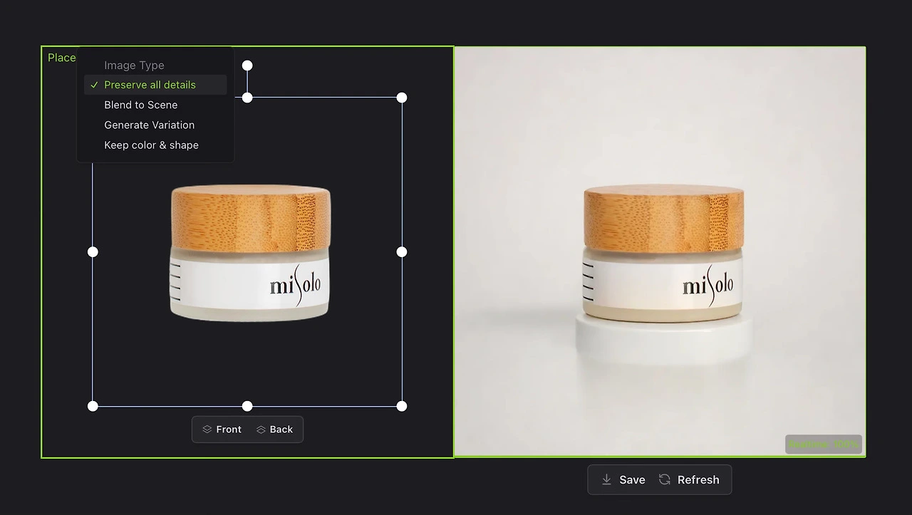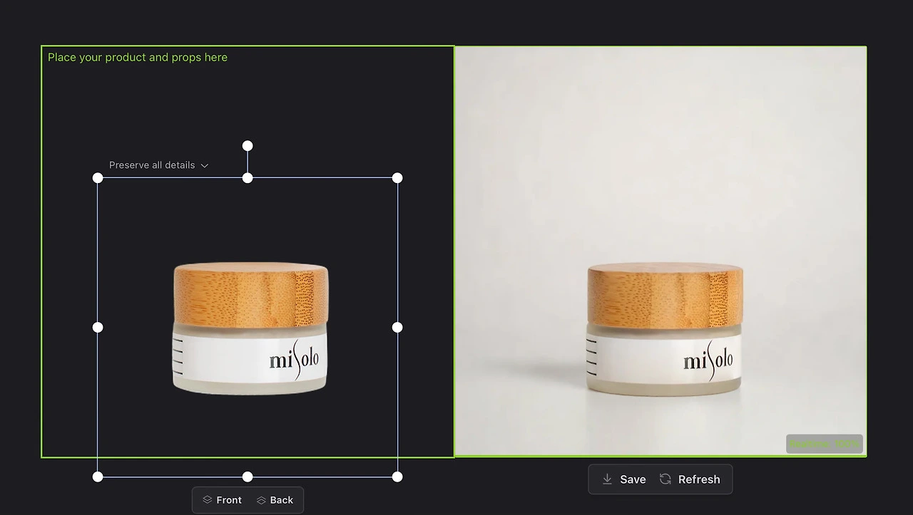 14. 이제 상품을 원하는 크기, 원하는 위치에 배치해 주세요. 저는 살짝 아래로 배치해 보도록 하겠습니다. 선택한 상태에서 아래로 내려주면 됩니다. 이후 다시 “Preserve all details”을 선택하시면 다음과 같이 상품의 훼손 없이 아래로 위치가 변경되었습니다.