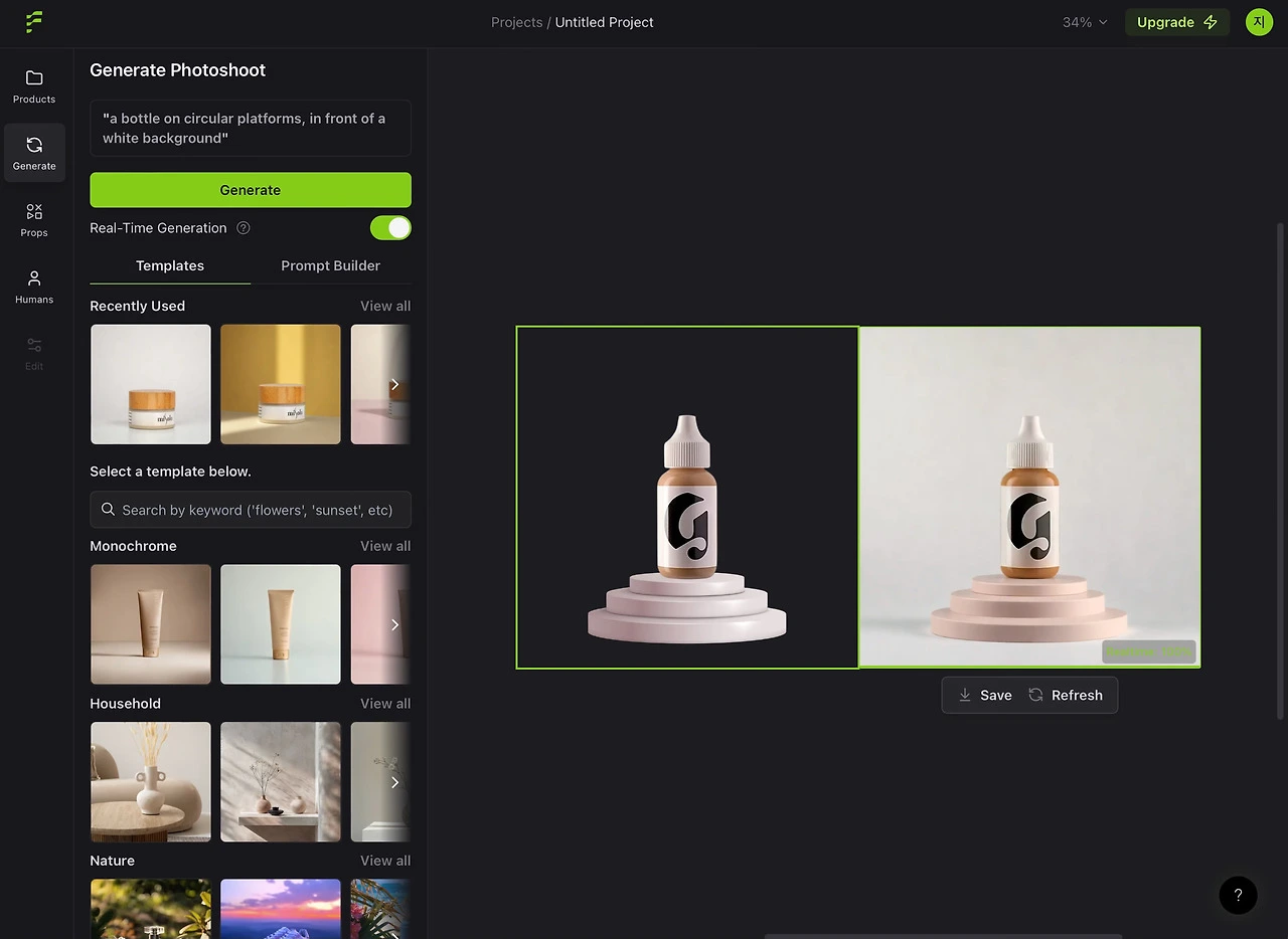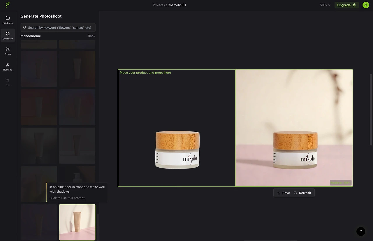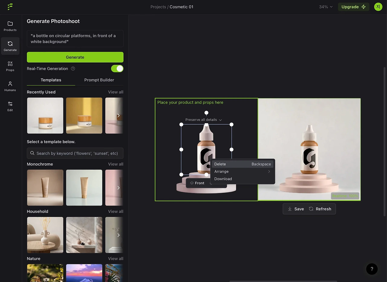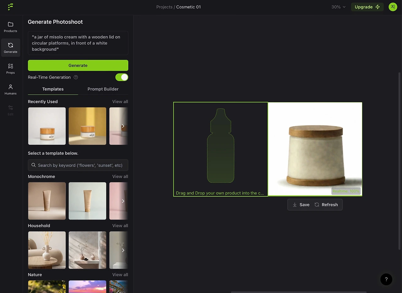 상품 사진 한 장이 있습니다. 가끔 분위기도 바꾸고 싶고, 세련미를 뽐내고 싶기도 합니다. 그때마다 스튜디오에 촬영을 요청합니다. 이 과정과 비용을 생략하고 빠르게 원하는 이미지를 얻고 싶다는 생각을 해 본 적이 있는지요? 작게는 소품부터 크게는 가구에 이르기까지 상품의 사이즈와 상관없이 불과 몇 초 만에 이것을 실현할 수 있습니다.