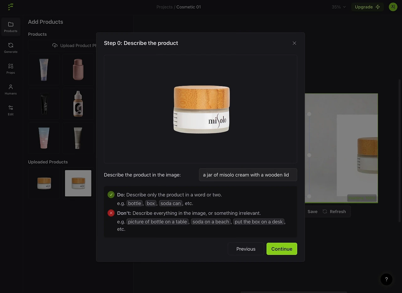 10. 두 번째 뜨는 팝업입니다. 해당 상품을 글로 설명하는 문구가 표시됩니다. 이 문구는 프롬프트로 전환하여 사용해도 좋고 이미지의 대체 문구로 사용해도 좋습니다. 이 설명은 추후 프롬프트 영역을 설명할 때 다시 말씀드리도록 하겠습니다. 이번에는 “Continue”를 클릭하여 다음 단계로 이동하겠습니다.