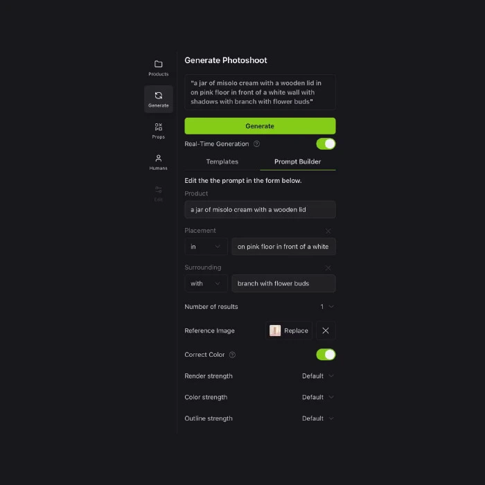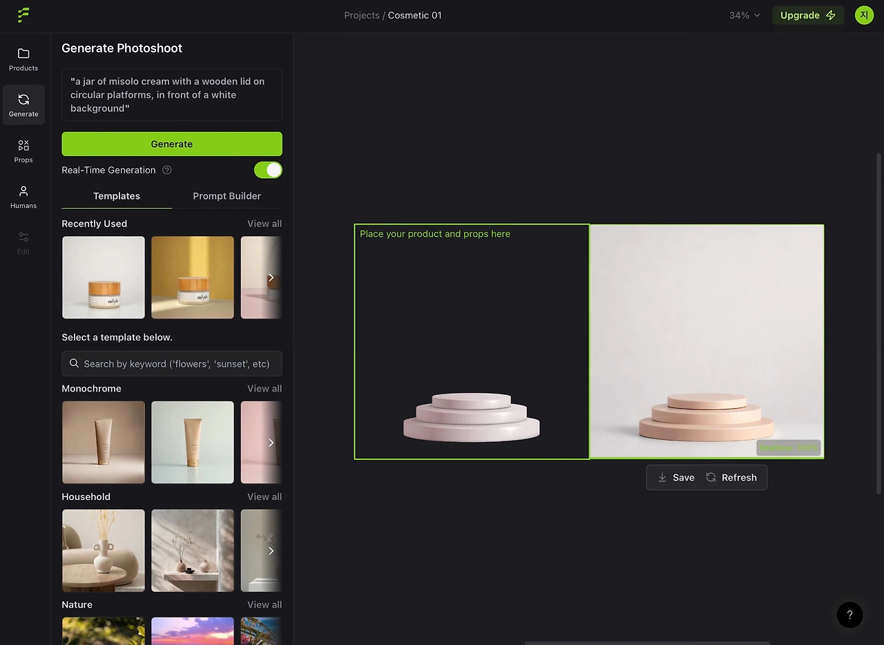 - Generate : 배경 템플릿과 프롬프트를 제공하고 이미지를 생성하는 메뉴입니다.