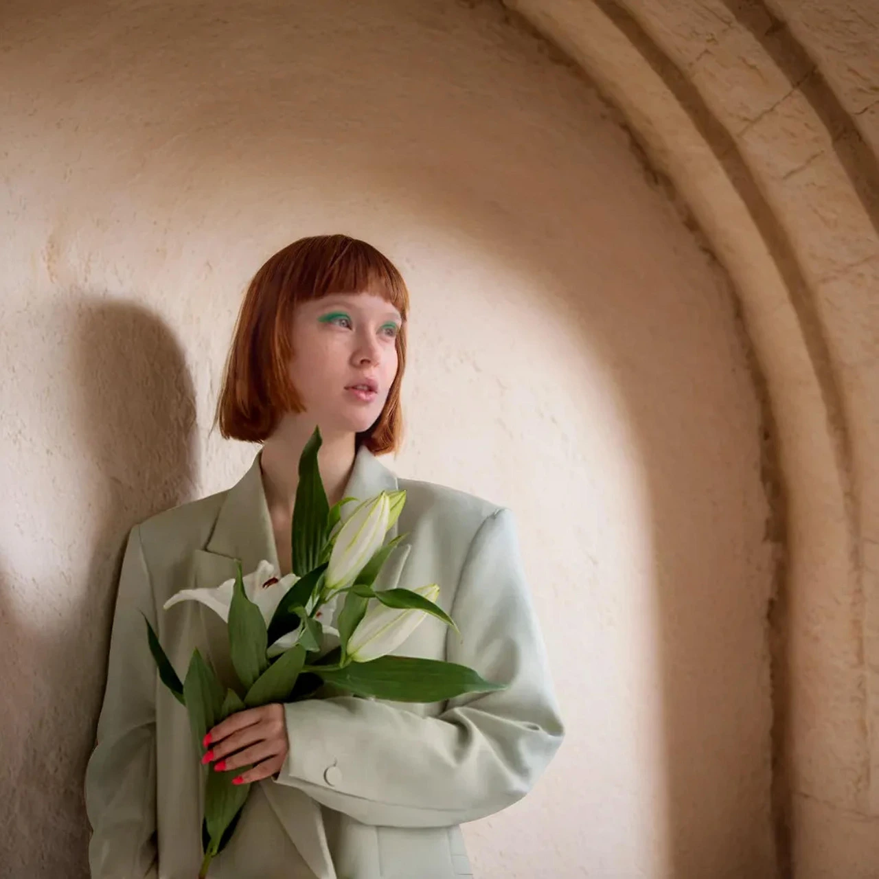 1. 오버 핏 재킷을 입은 여성 모델을 촬영한 이미지를 만들어 보도록 할게요. 먼저 업로드 이미지입니다.