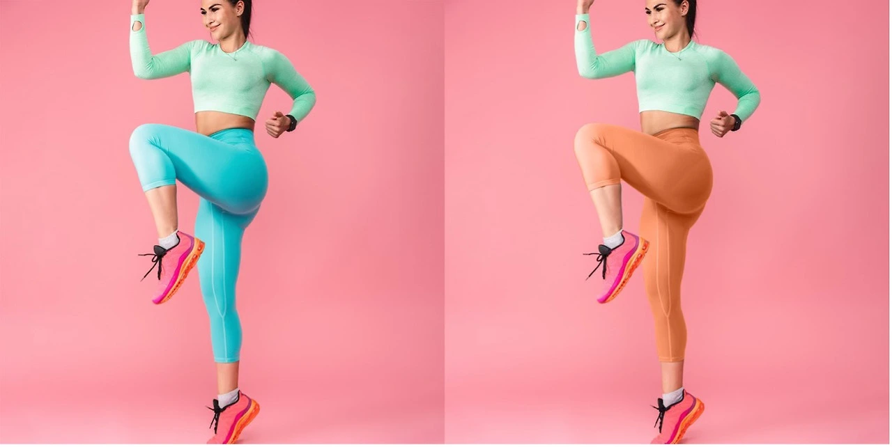 6. 그럼 레깅스를 선택한 상태에서 첫 번째 추천 색상을 적용해 보겠습니다. Recommended Colors의 첫 번째 동그라미를 클릭하세요. 적용 전에는 하늘색 레깅스였는데요. 오렌지색으로 바뀐 것을 확인할 수 있습니다.