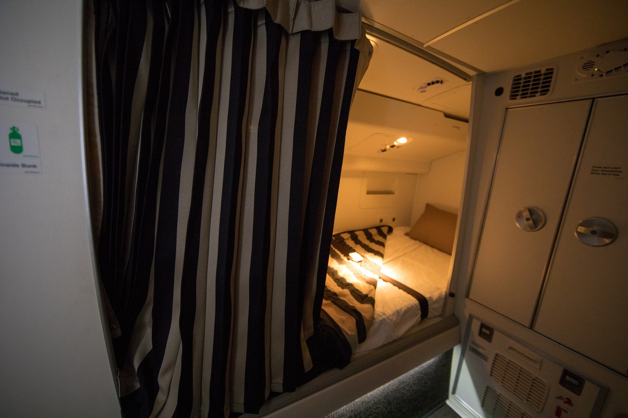 들어보면 매우 불편할 것 같은데, 의외로 안락하다. 천장이 낮고 공간이 좁으니 요람에 들어있는 느낌이 든다. 기류가 적당히 흔들어주면 안성맞춤. 그러나 너무 잘 자고 나면 조금 미안하다. 목베개 끼고 쪽잠을 자는 승객에 비하면, 단 몇 시간이라도 토끼굴에 기어들어가 허리 펴고 잘 수 있는 것도 복이다.