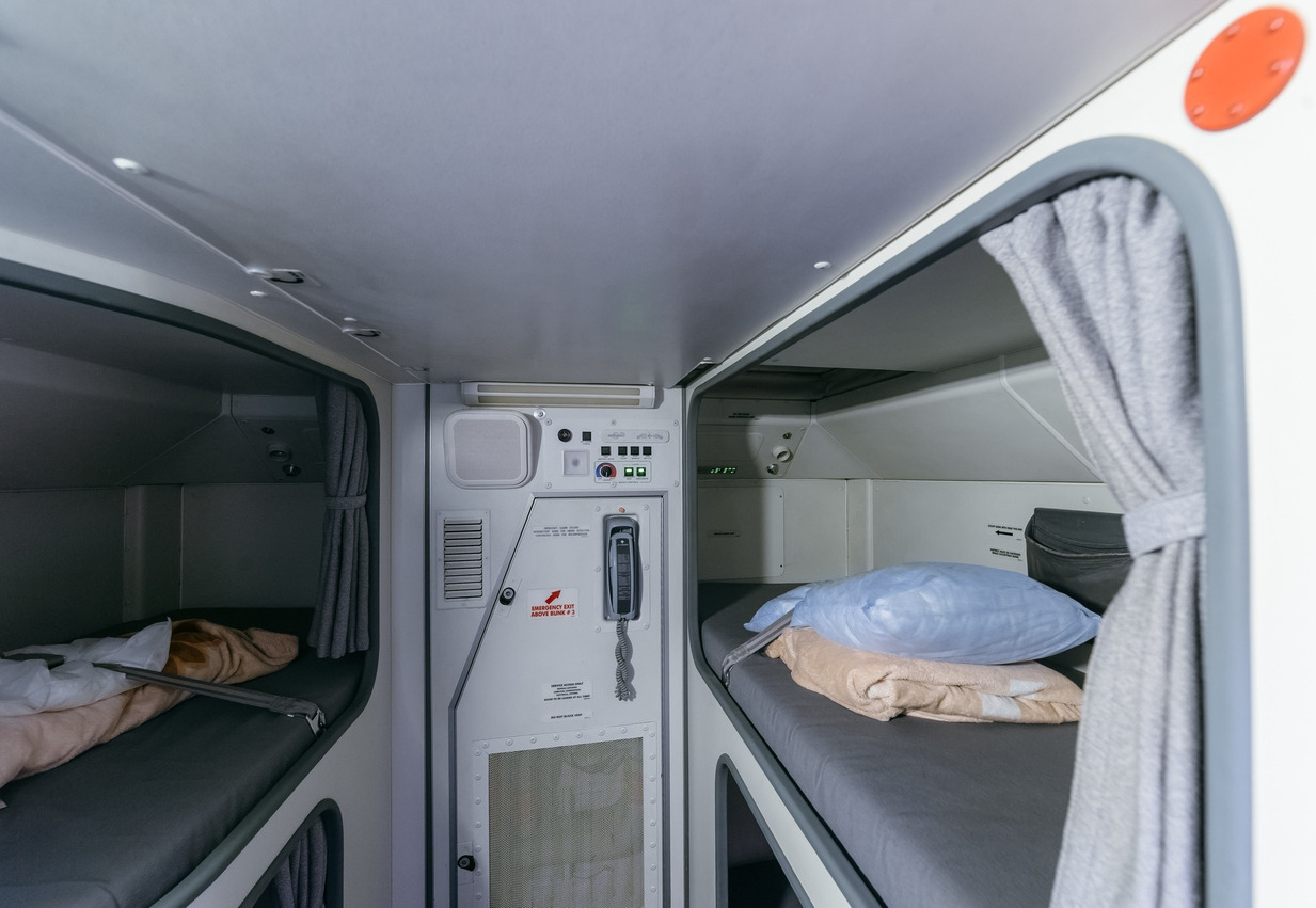 조종사 침실에는 두 개의 벙크 침상이 옆으로 나란히 혹은 아래위 이층으로 들어있고, 객실 승무원 침실에는 도미토리처럼 더 많은 침상이 빼곡히 들어있다. 공간이 비좁다 보니 휴식할 때 서로 방해가 되기 쉬운데, 빛은 커튼과 안대로, 소리는 귀마개로 어느 정도 방어가 가능하지만 냄새는 쉽지 않다. 원만한 회사 생활을 위해 항상 청결을 유지하고, 기압 변화에 민감한 사람은 미리미리 화장실에서 가스 배출을 해두는 것이 좋겠다.