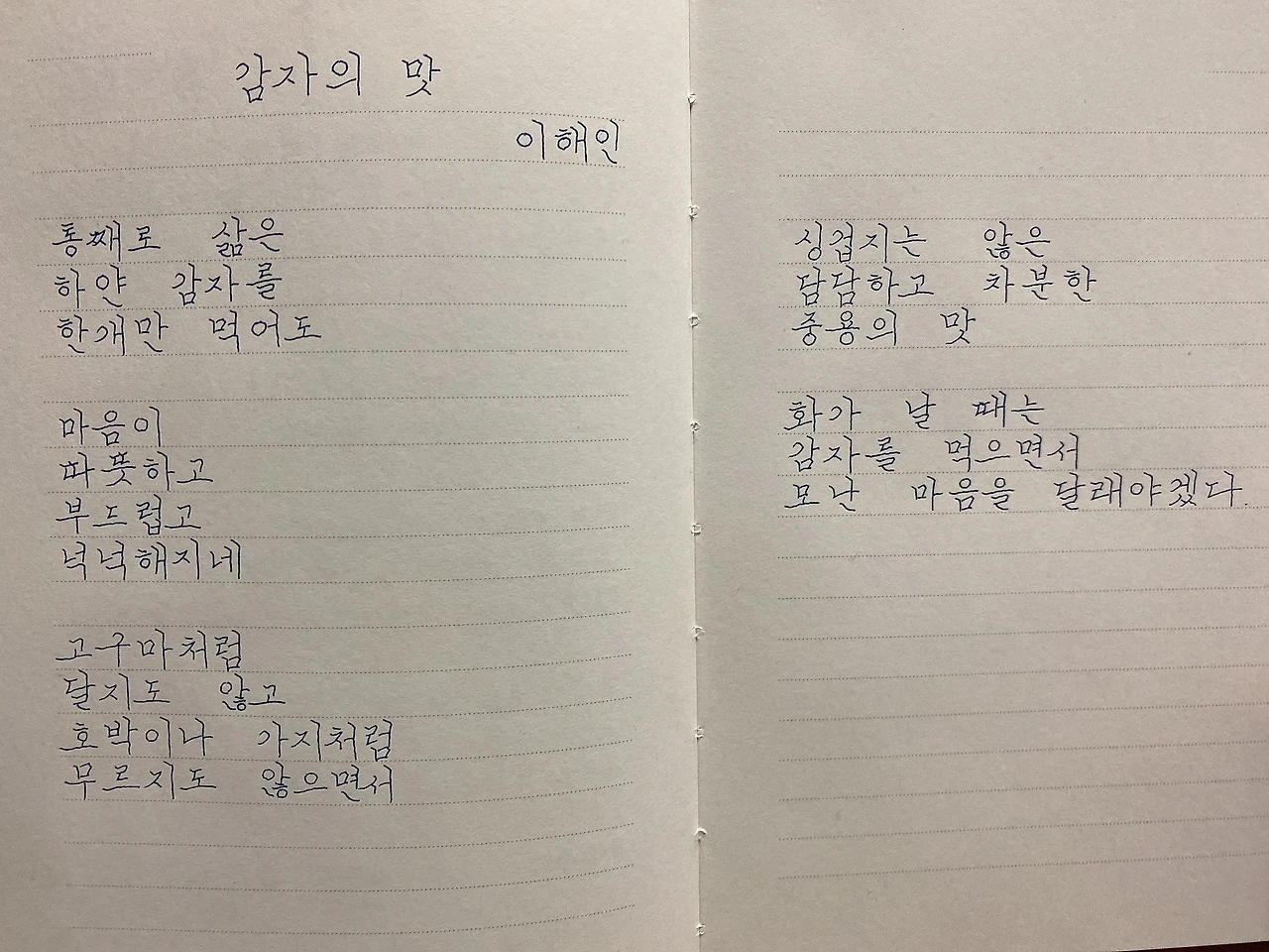 평범한 직장인. 사내 동호회를 통해 매일 한편 손으로 시 읽기를 시작한 이후로, 매일 시 한편을 필사 합니다. 필사한 시가 저작권에 문제가 된다면 말씀해주세요.