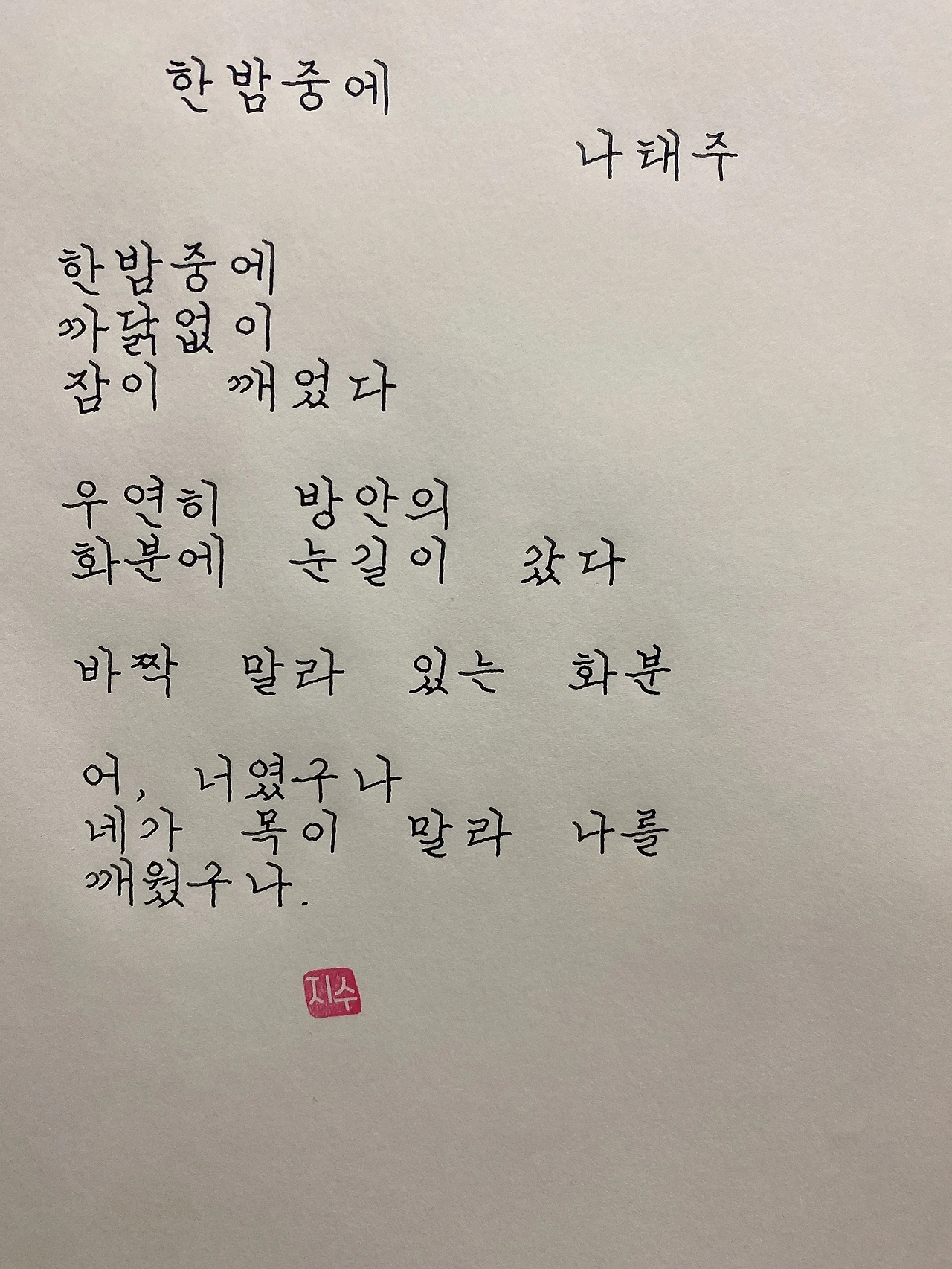 평범한 직장인. 사내 동호회를 통해 매일 한편 손으로 시 읽기를 시작한 이후로, 매일 시 한편을 필사 합니다. 필사한 시가 저작권에 문제가 된다면 말씀해주세요.