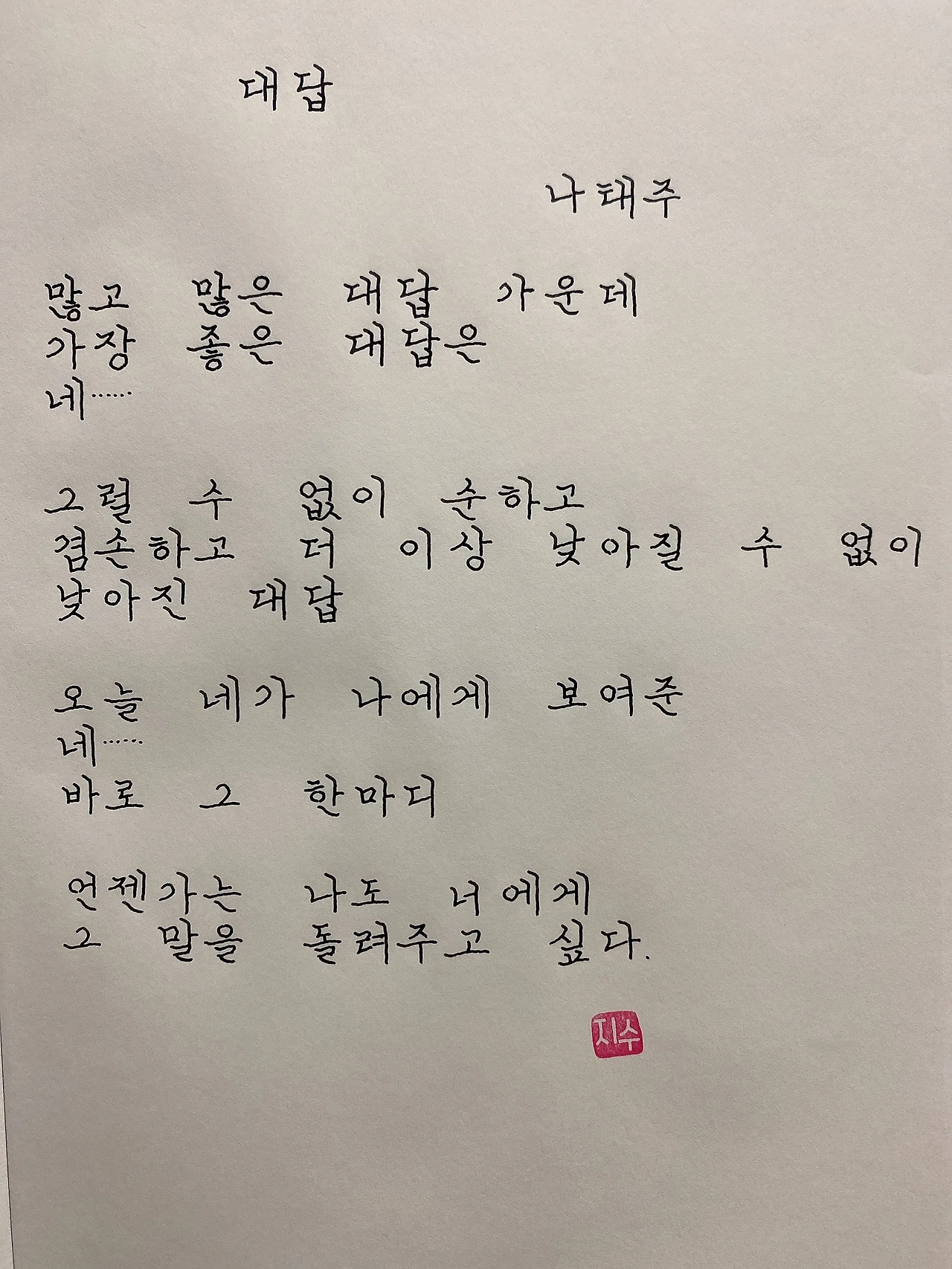 평범한 직장인. 사내 동호회를 통해 매일 한편 손으로 시 읽기를 시작한 이후로, 매일 시 한편을 필사 합니다. 필사한 시가 저작권에 문제가 된다면 말씀해주세요.