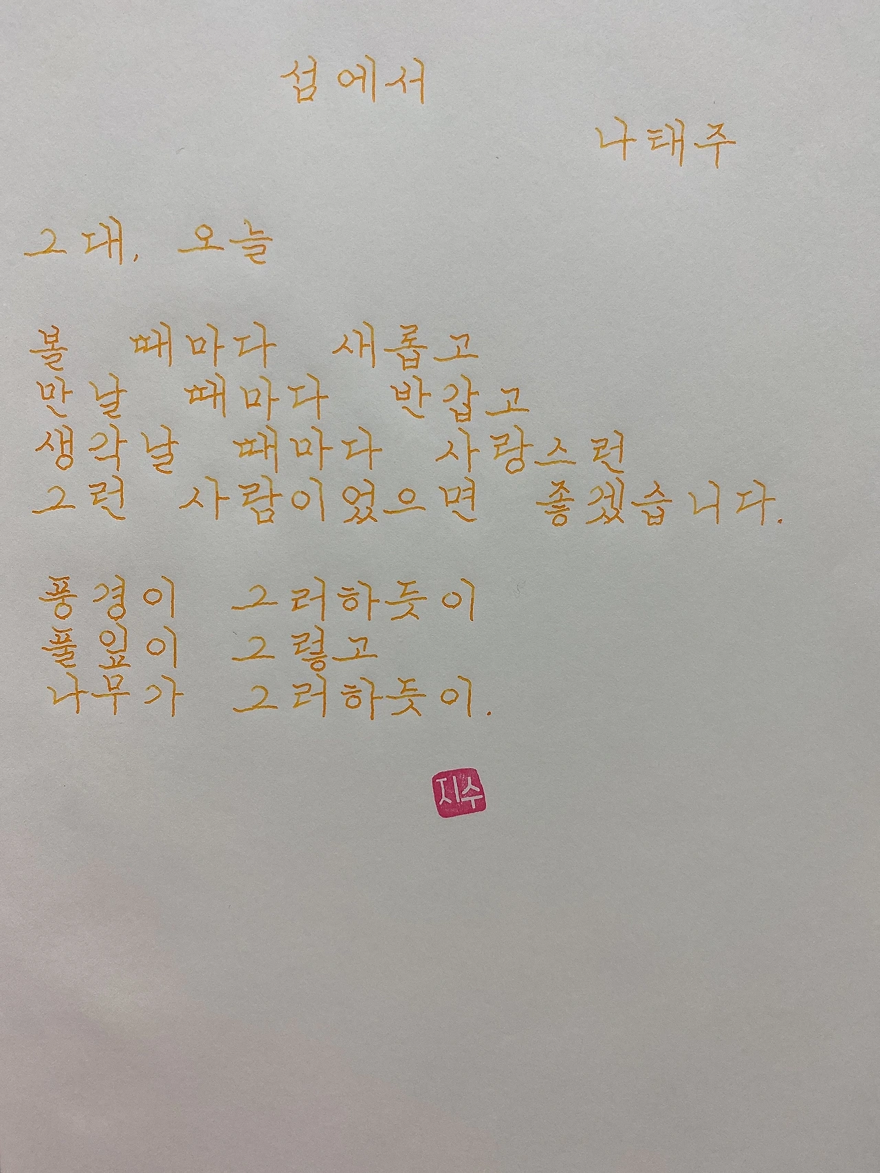 평범한 직장인. 사내 동호회를 통해 매일 한편 손으로 시 읽기를 시작한 이후로, 매일 시 한편을 필사 합니다. 필사한 시가 저작권에 문제가 된다면 말씀해주세요.